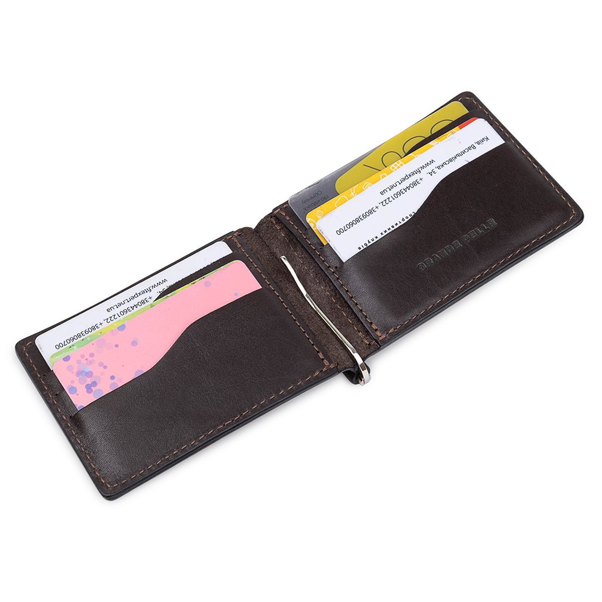 Затискач для грошей з натуральної шкіри, яка стійка до зношування та має відмінні експлуатаційні характеристики. Має насичений коричневий колір та гладку м'яку фактуру. Усередині розташувалися затискач для грошей, слоти для пластикових та кредитних карток, дві потаємні кишеньки, а також зручна зовнішня монетниця на блискавці.