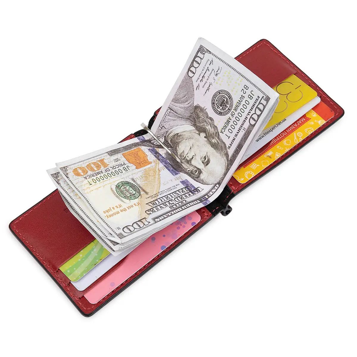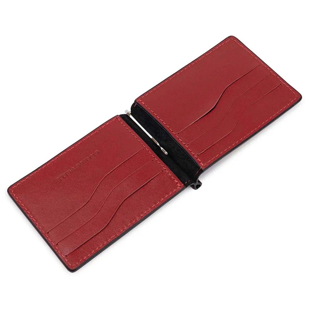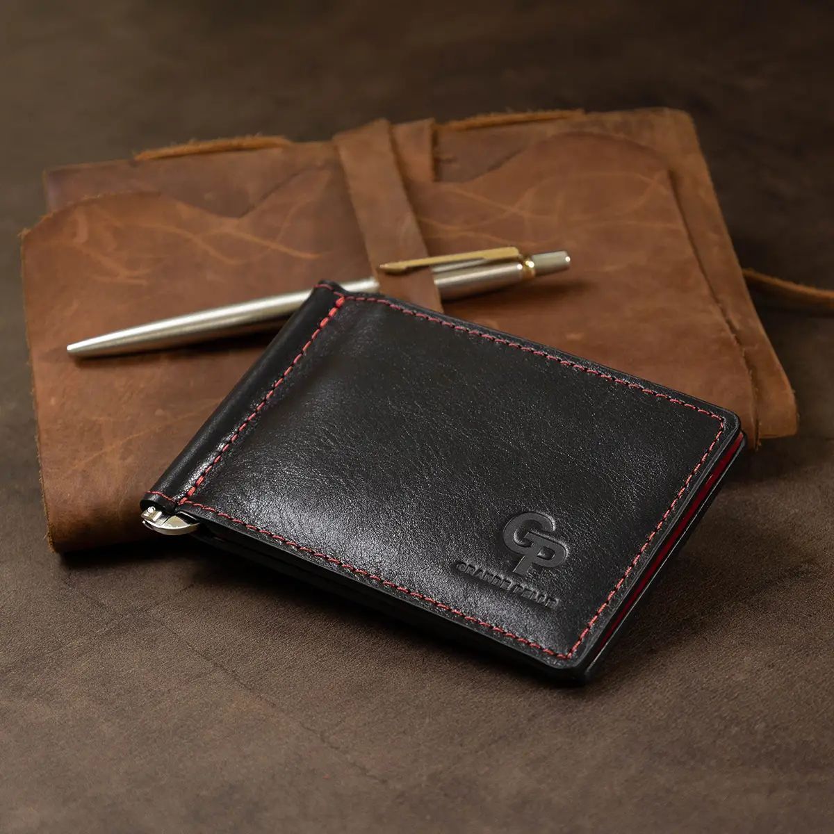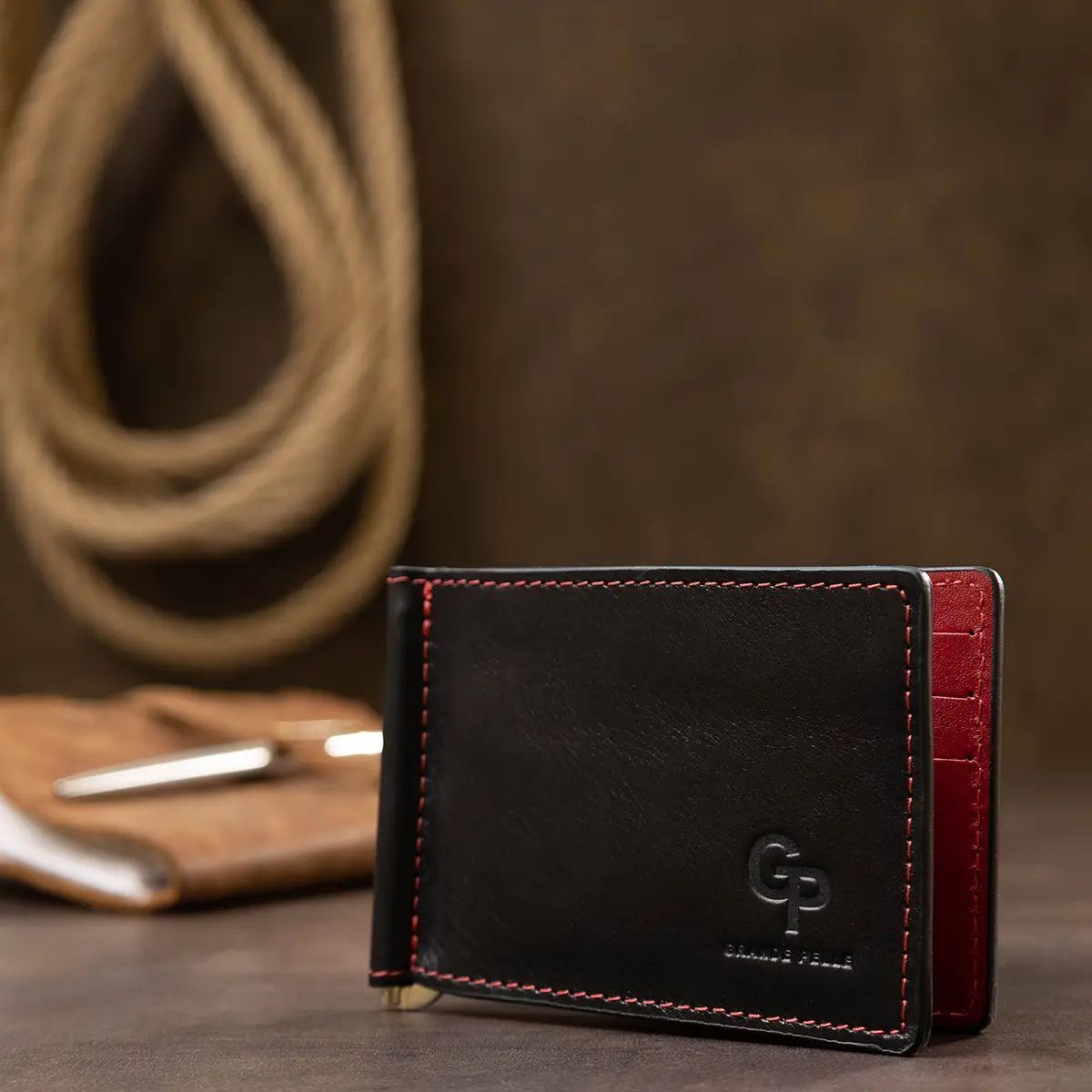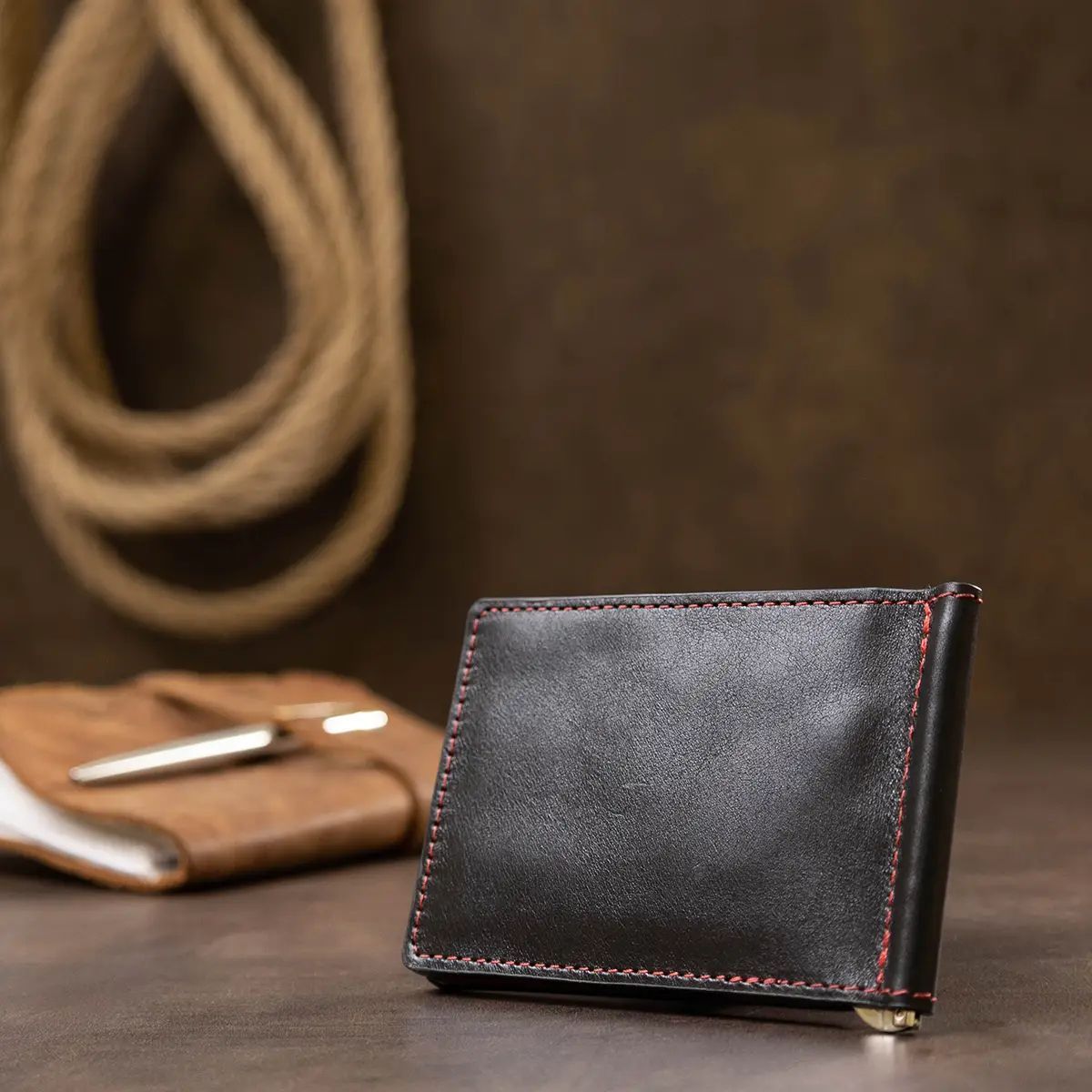 Стильний шкіряний затискач для грошей з гарним поєднанням чорного та червоного кольору, по периметру також рядок із червоною ниткою. Усередині розташувалися металевий затискач, слоти для пластикових та візитних карток і дві потаємні кишені. Сам виріб упакований у фірмовий ущільнений чохол.