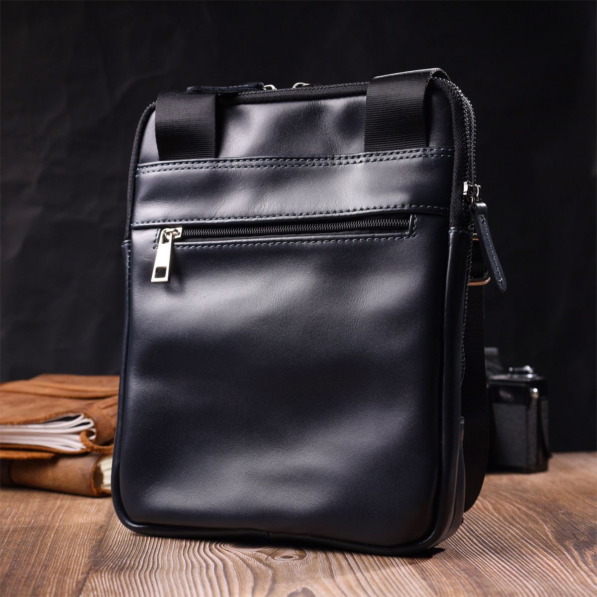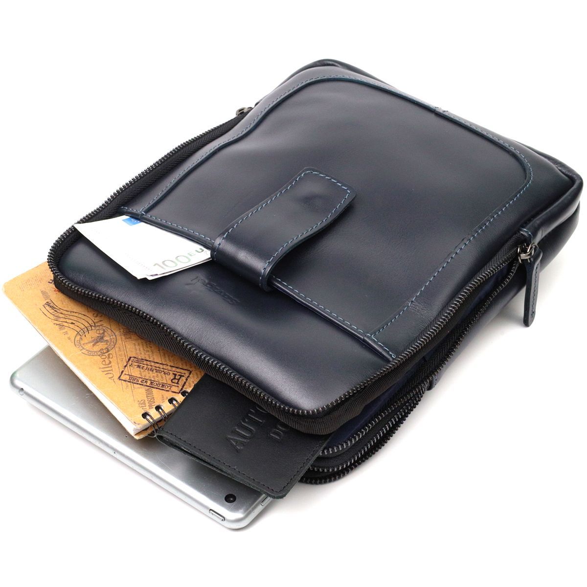 Стильна сумка із натуральної шкіри на два відділення. Модель в оригінальному синьому кольорі. Аксесуар складається з двох основних відділень на блискавках, кишені для планшета, двох кишень усередині – одна з них на блискавці та двох кишень зовні. У дизайні моделі немає ніяких зайвих деталей, при цьому сумка виглядає дуже модно і стильно. Сумка виготовлена з урахуванням усіх модних тенденцій. На лицьовій стороні моделі тиснення у вигляді логотипу бренду. Аксесуар доповнений текстильним незнімним ремінцем. Шкіряна сумка – найкращий подарунок для будь-якого чоловіка. Замовляйте цю модель як для себе, так і на подарунок.