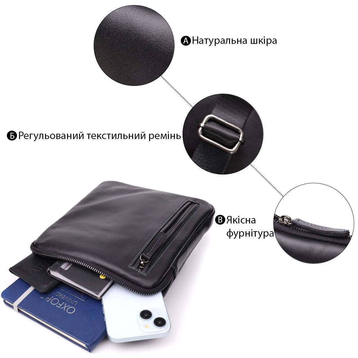 - всередині: кишеня на блискавці, відкрита кишеня та осередок для кредитних карток;