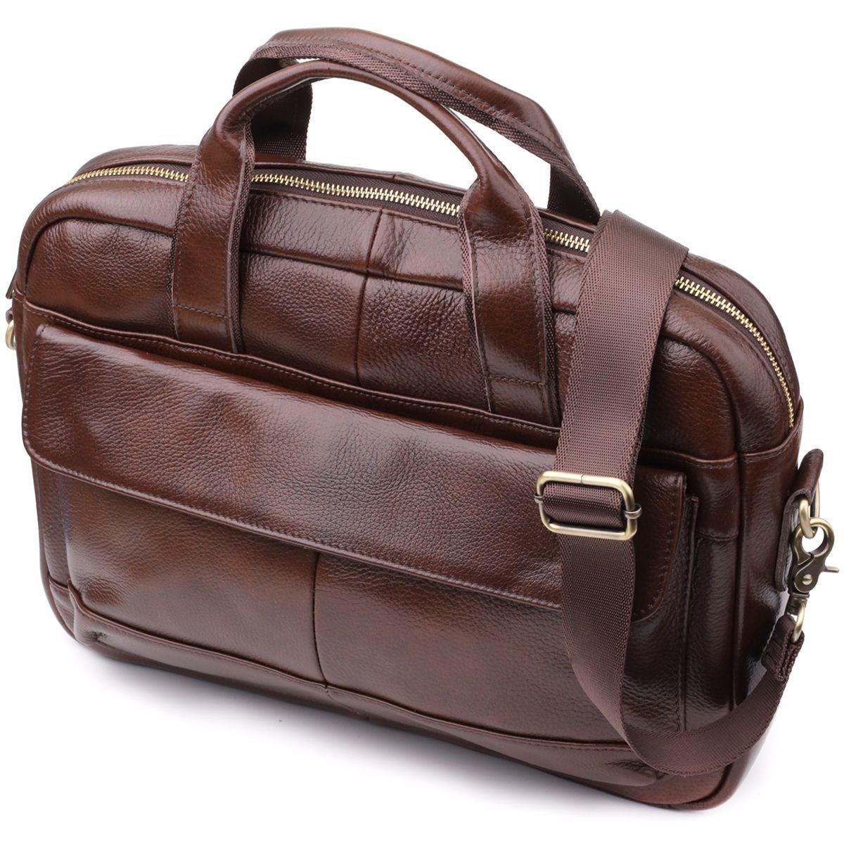 Стильний чоловічий портфель із натуральної зернистої шкіри коричневого кольору - це поєднання надійності, функціональності та стриманої елегантності. Фактурна зерниста поверхня надає виробу виразного зовнішнього вигляду, а також підвищує стійкість до зношування та подряпин, що робить його відмінним вибором для щоденного використання.