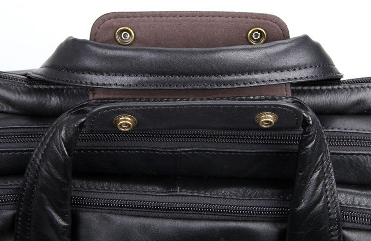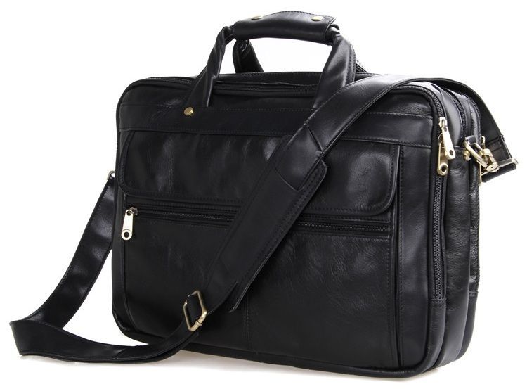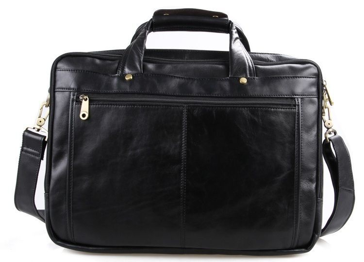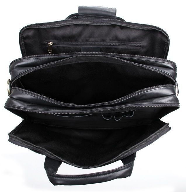 Містка чоловіча багатофункціональна сумка для ноутбука. Аксесуар виконаний з гладкої натуральної шкіри приємної на дотик. Колір фурнітури латунь. На лицьовій стороні виробу розташована накладна кишеня під клапаном та невелике відділення на блискавці. На задній стороні знаходиться кишеня на блискавці. Підкладка виконана із міцного текстильного чорного кольору. Сумку можна переносити в руці (ручки шкіряні) або через плече (у комплекті знімний, регульований плечовий ремінь).
