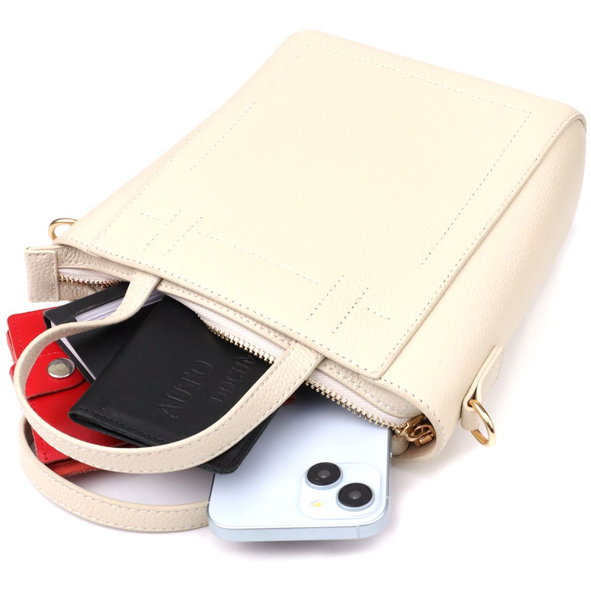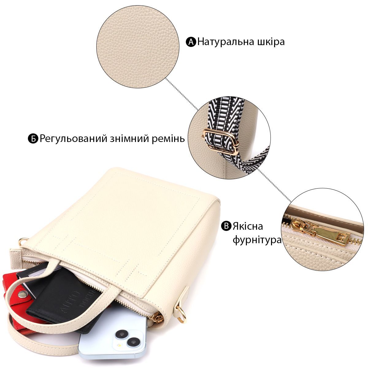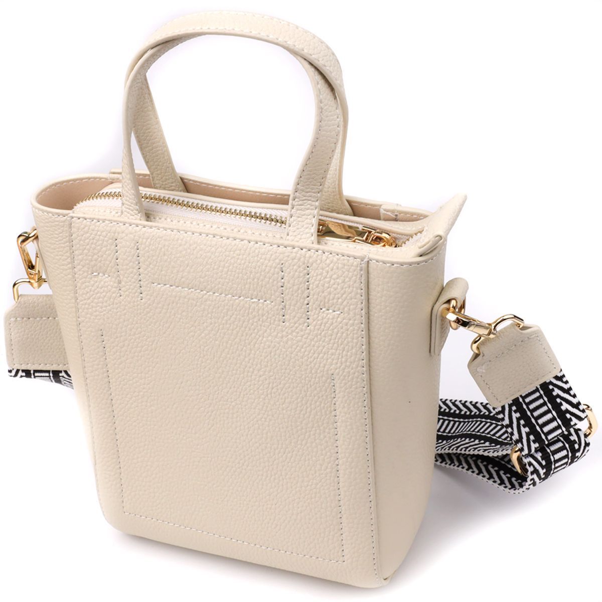 Фурнітура у вишуканому золотому кольорі чудово поєднується з білим тоном шкіри, надаючи аксесуару витончений та благородний вигляд. Знімний текстильний ремінець забезпечує комфорт при носінні - сумку можна носити як на плечі, так і через плече, легко адаптуючи її під повсякденний або ошатний образ.