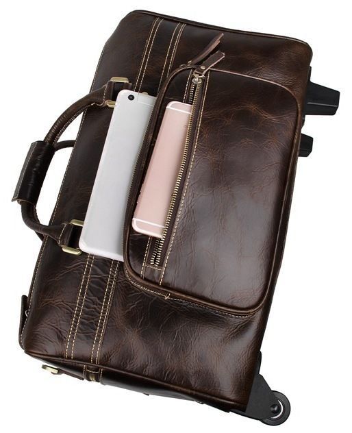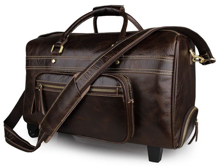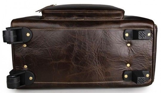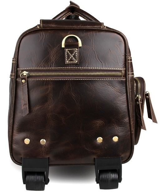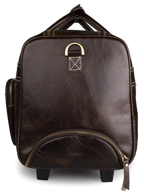 Елітна дорожня сумка на 2-х колесах із натуральної вінтажної шкіри. Колір фурнітури латунь. На лицьовій стороні сумки розташовані дві накладні кишені на блискавках. На одній бічній грані знаходиться відділення на блискавці, а на другій розташоване відділення для висувної ручки. Підкладка виробу виконана з міцної тканини чорного кольору. Сумку можна переносити в руці, через плече або котити за допомогою зручної ручки та наявності двох коліщатків. Аксесуар акуратно прошитий надміцною ниткою.