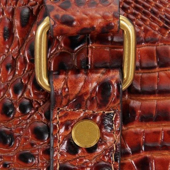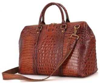 Ексклюзивна дорожня сумка із натуральної шкіри з фактурою під крокодила. Вироби зі шкіри подібної фактури дуже популярні цього сезону. Колір фурнітури латунь. Сумка надійно прошита надміцною ниткою. Переносити цей аксесуар можна в руці за допомогою зручних шкіряних ручок, а також через плече (у комплекті знімний, регульований плечовий ремінь). Сумка закривається за допомогою блискавки. Виріб упакований у текстильний чохол.