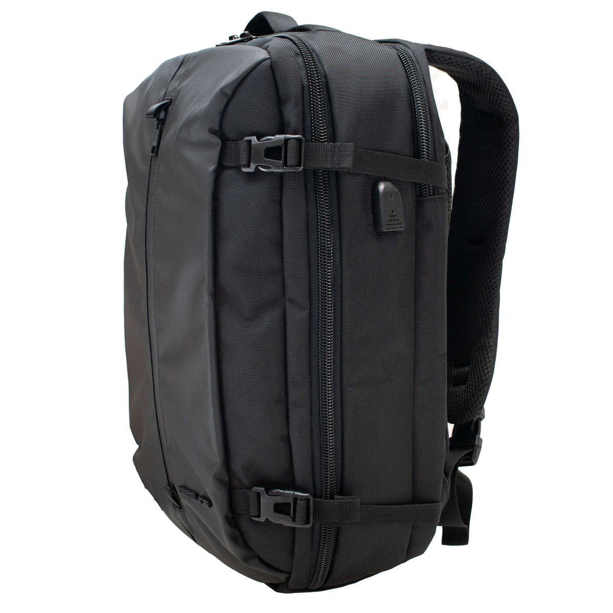 Сумка-рюкзак Semi Line USB 20 Black виконана з міцного водостійкого поліестеру 900D з PVC покриттям. На задній стороні сумки знаходиться поперечна стрічка для кріплення на телескопічні ручки валіз. Модель має дві м'які ручки для транспортування в руках в горизонтальному чи вертикальному положенні. Блискавки на зовнішніх кишенях мають захист від дощу.