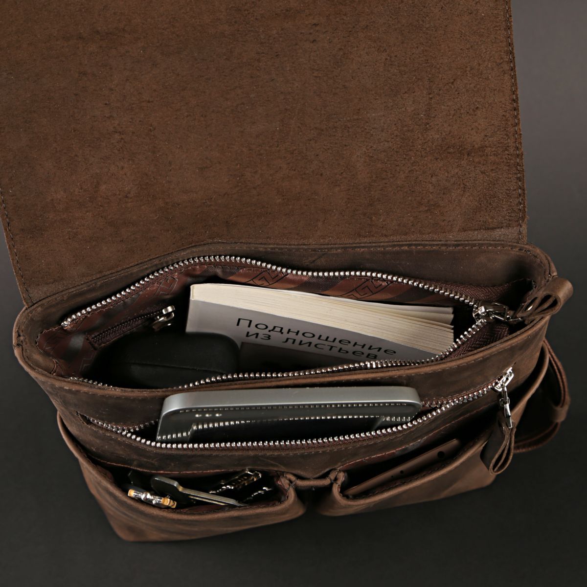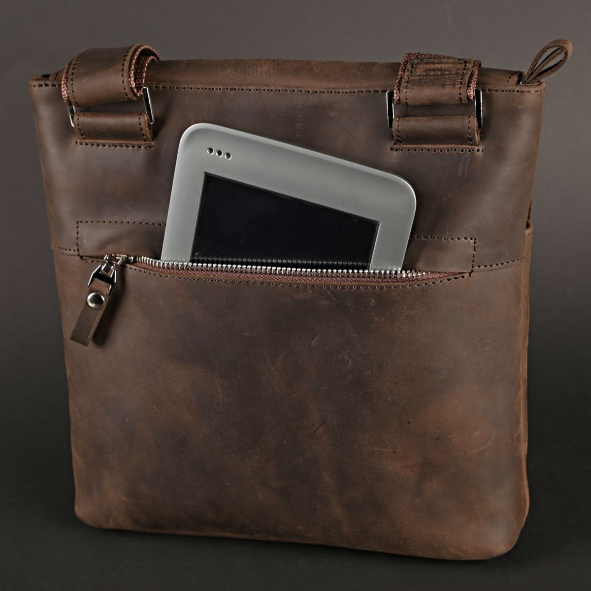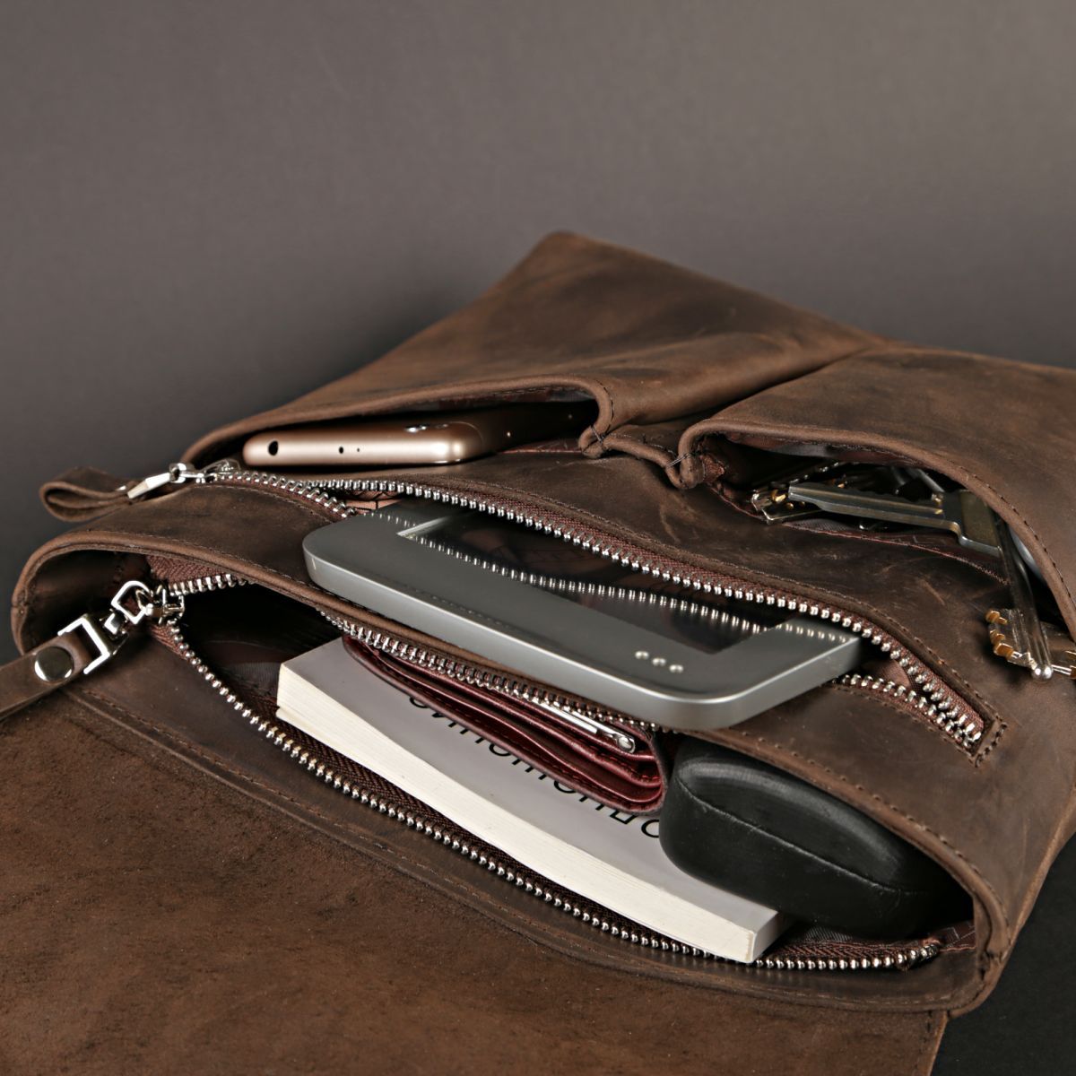 Сумка середніх розмірів з натуральної шкіри для чоловіків, які щодня носять із собою багато дрібних речей (ключи, телефон, блокнот) , портмоне, невеликий планшет, і т.д.).