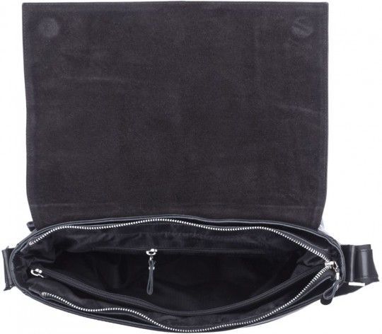Ззаду на сумці розташована прорізна кишеня для дрібних речей. Закривається дана модель клапаном, обшитим по контуру міцною ниткою із декоративною пряжкою на магнітній кнопці.