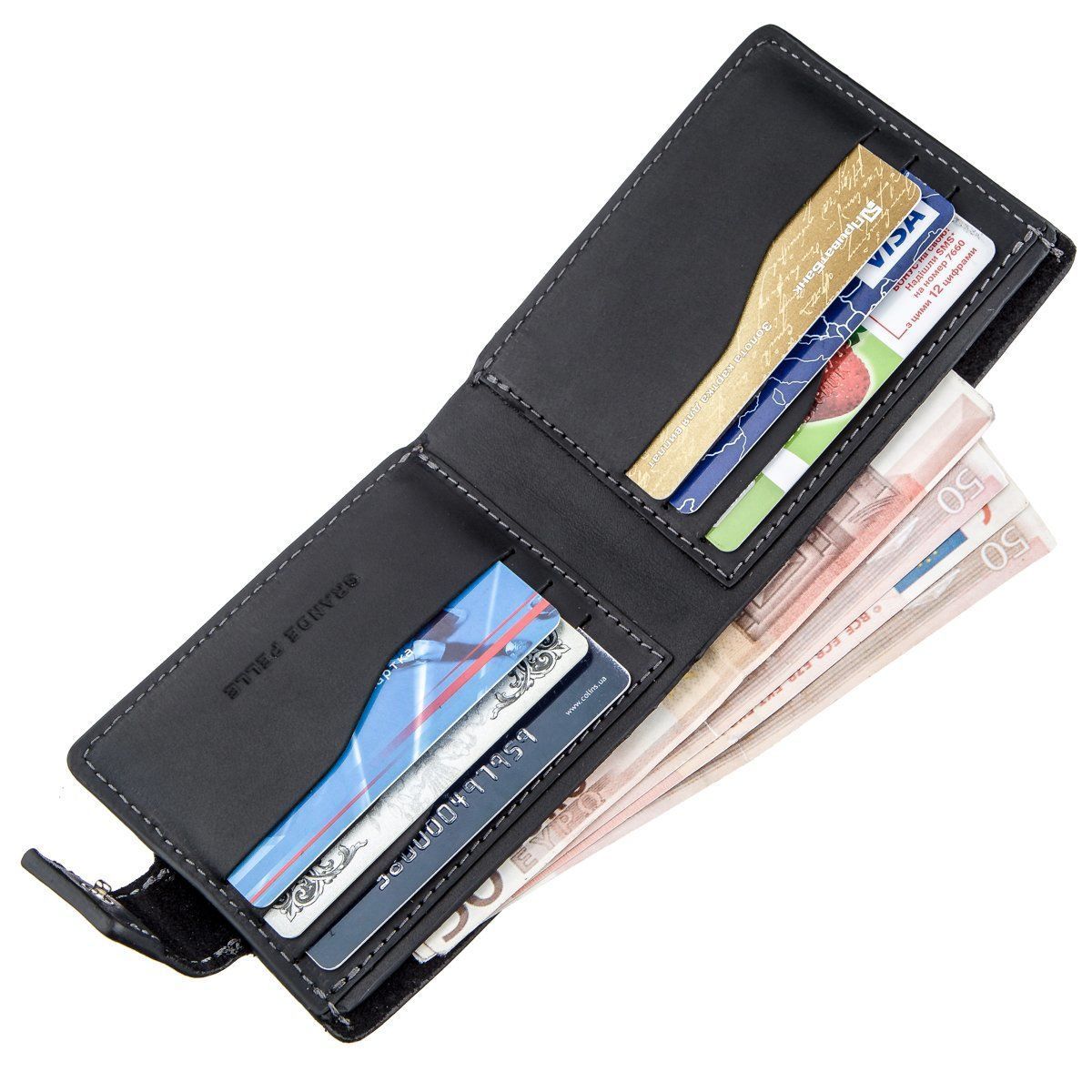 Тонкий класичний портмоне з натуральної італійської шкіри найвищої якості. Портмоне у класичному стилі користуються особливою популярністю серед наших клієнтів. Аксесуар закривається на шкіряний хлястик із кнопкою. На лицьовій стороні виробу тиснений логотип бренду. Модель доповнена сріблястою фурнітурою та прошита чорною ниткою по краях. Виріб упакований у фірмову картонну коробку, яка може замінити подарункову упаковку. Портмоне стане чудовим рішенням для подарунка близькій людині.