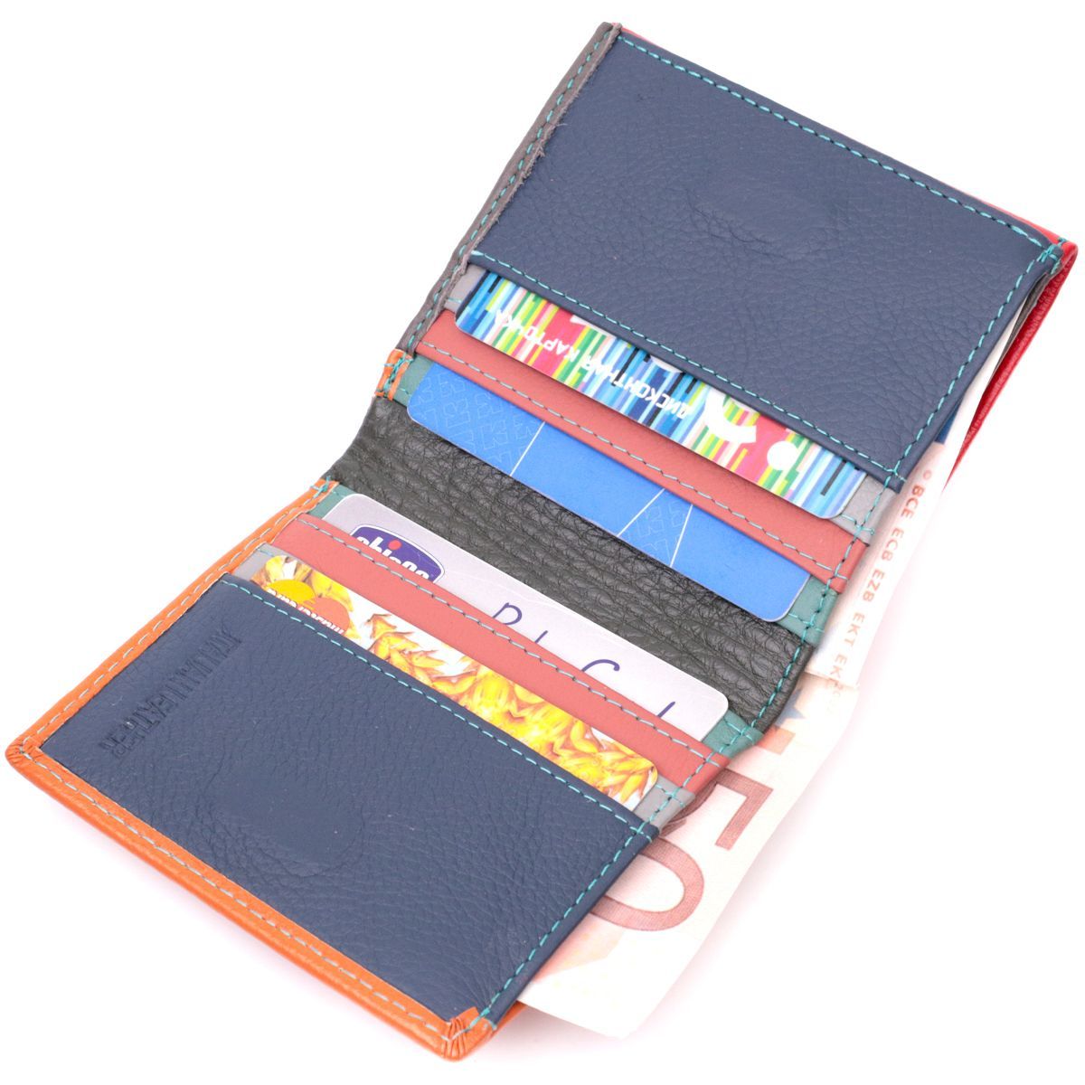 Жіноче яскраве портмоне в два складання з натуральної шкіри найвищої якості. Фішкою цього гаманця є його багатобарвна гама, такий аксесуар одразу впадає у вічі, складається він з двох містких відділень для купюр, шести осередків для карт, двох прихованих кишень та кишені для монет. Зовні виріб прошитий рівним рядком бірюзового кольору по краю і прикрашений металевим логотипом компанії виробника. Портмоне доповнено надійною фурнітурою та міцною підкладкою. Укомплектований гаманець у фірмову картонну коробку білого кольору.