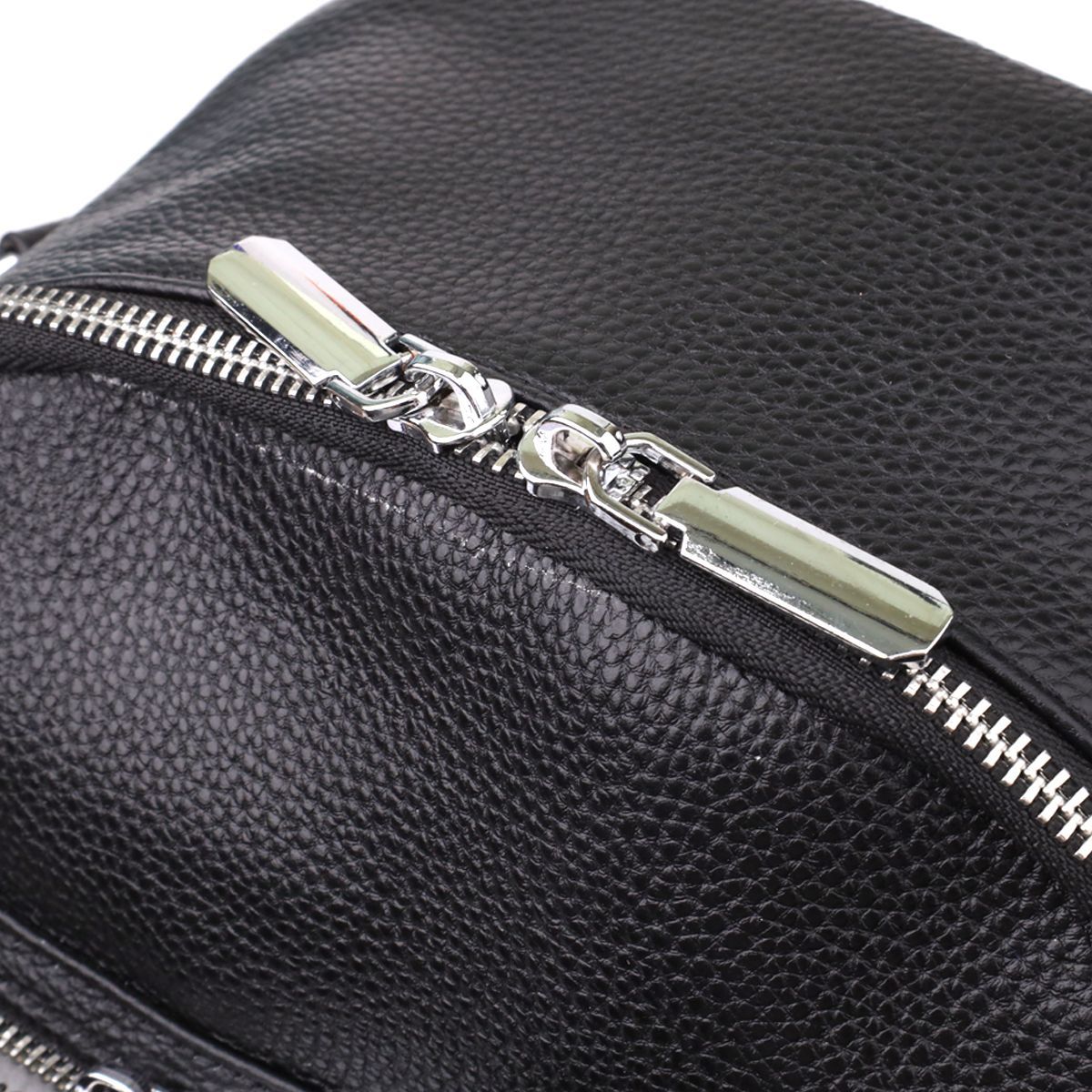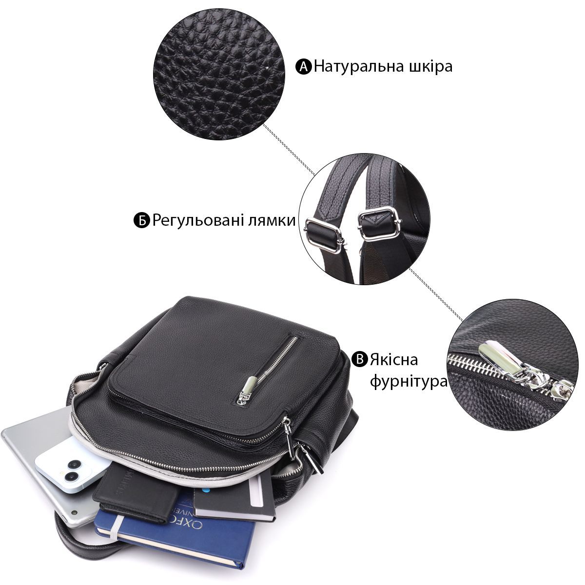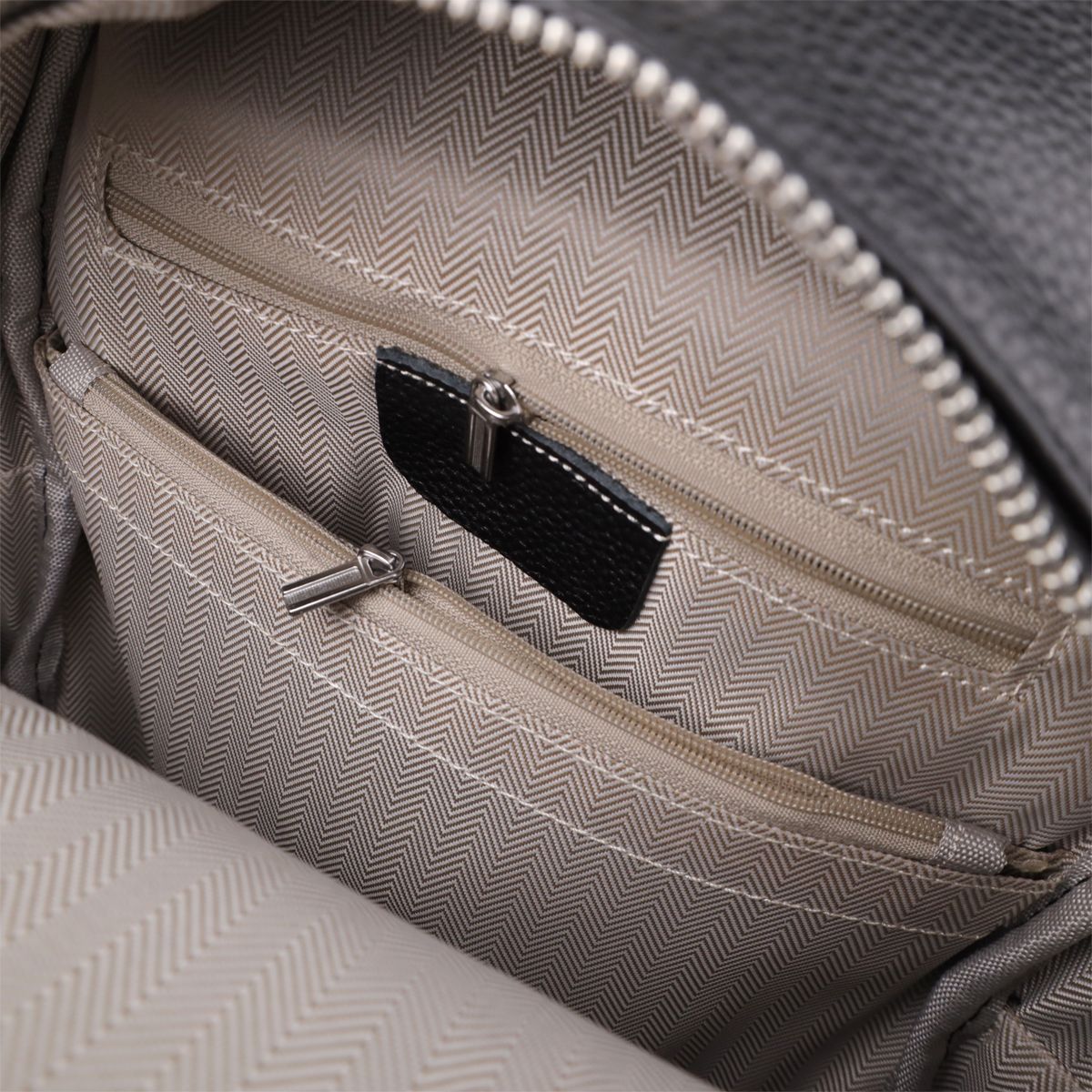 Жіночий шкіряний рюкзак виконаний у функціональному та сучасному дизайні, що ідеально підходить для повсякденного використання. Він оснащений одним основним відділенням на блискавці, всередині якого передбачені дві кишені на блискавках і одна відкритого типу для зручного зберігання необхідних речей.
