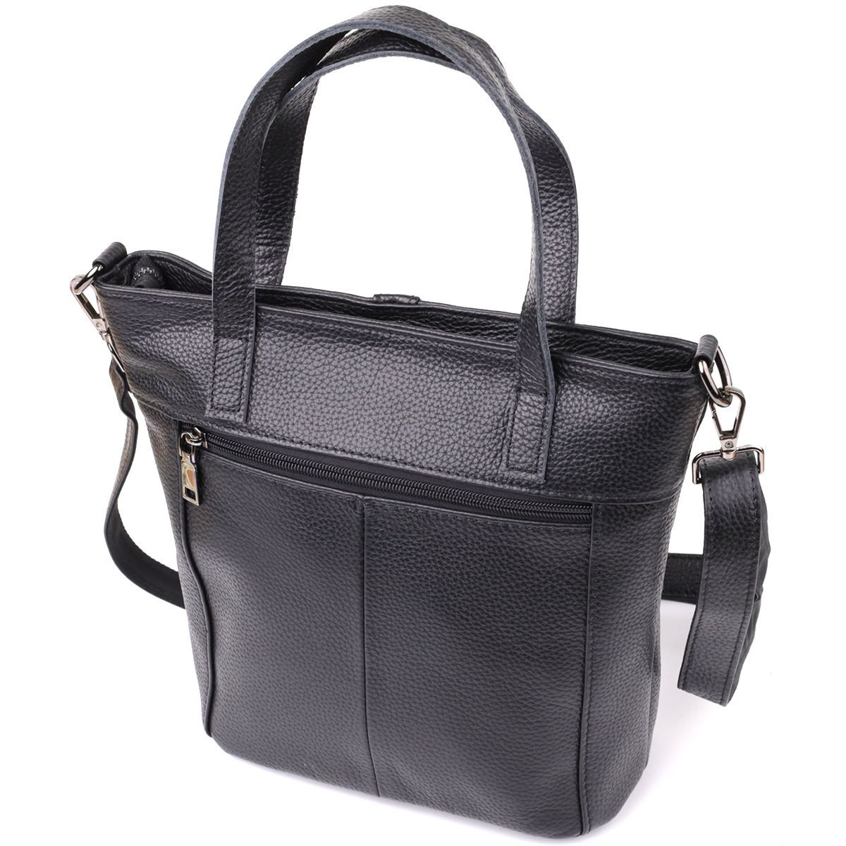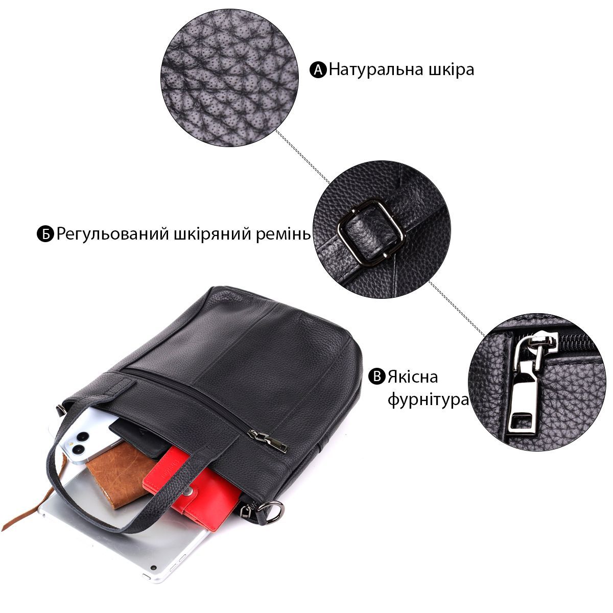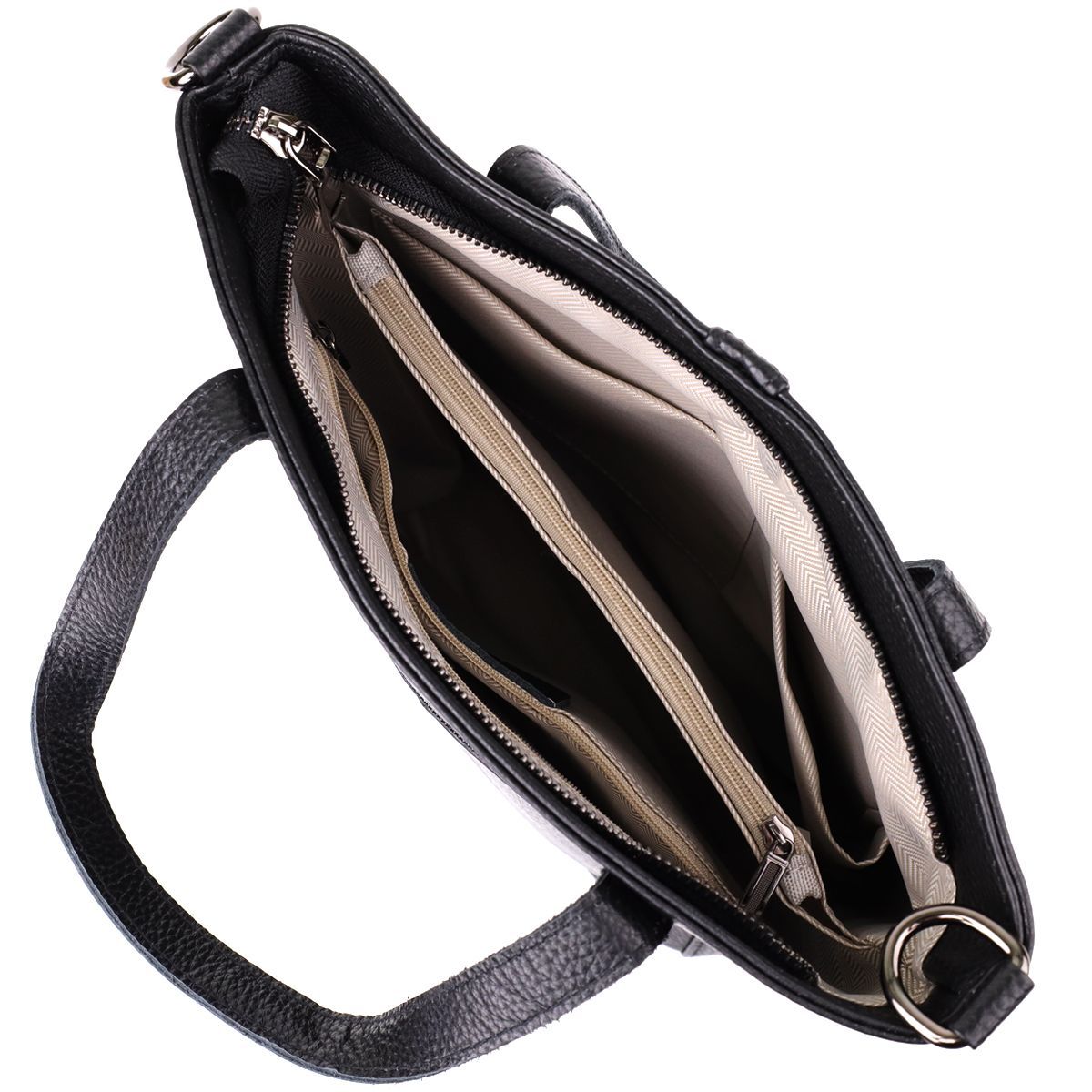 Стильна чорна шкіряна сумка у формі трапеції – це універсальний аксесуар, що поєднує сучасну елегантність та практичність. Вона виконана з натуральної шкіри високої якості, відрізняється щільною структурою та привабливим лаконічним силуетом. Сумка закривається на блискавку і має зручне основне відділення, всередині якого передбачена потайна кишеня на блискавці, кишеня-перегородка на блискавці та відкрита кишеня для дрібниць. Тверде дно допомагає сумці зберігати форму, а фурнітура кольору темного срібла наголошує на вишуканому характері моделі. Для зручності носіння передбачений знімний ремінь, що робить сумку комфортною як у повсякденних, так і більш урочистих образах.