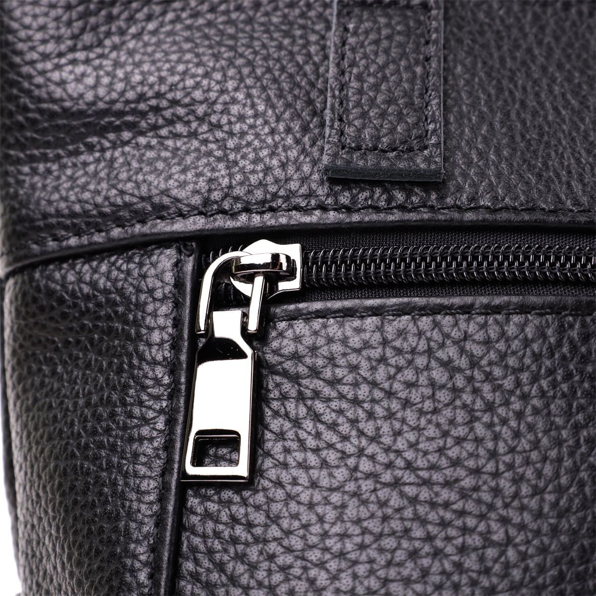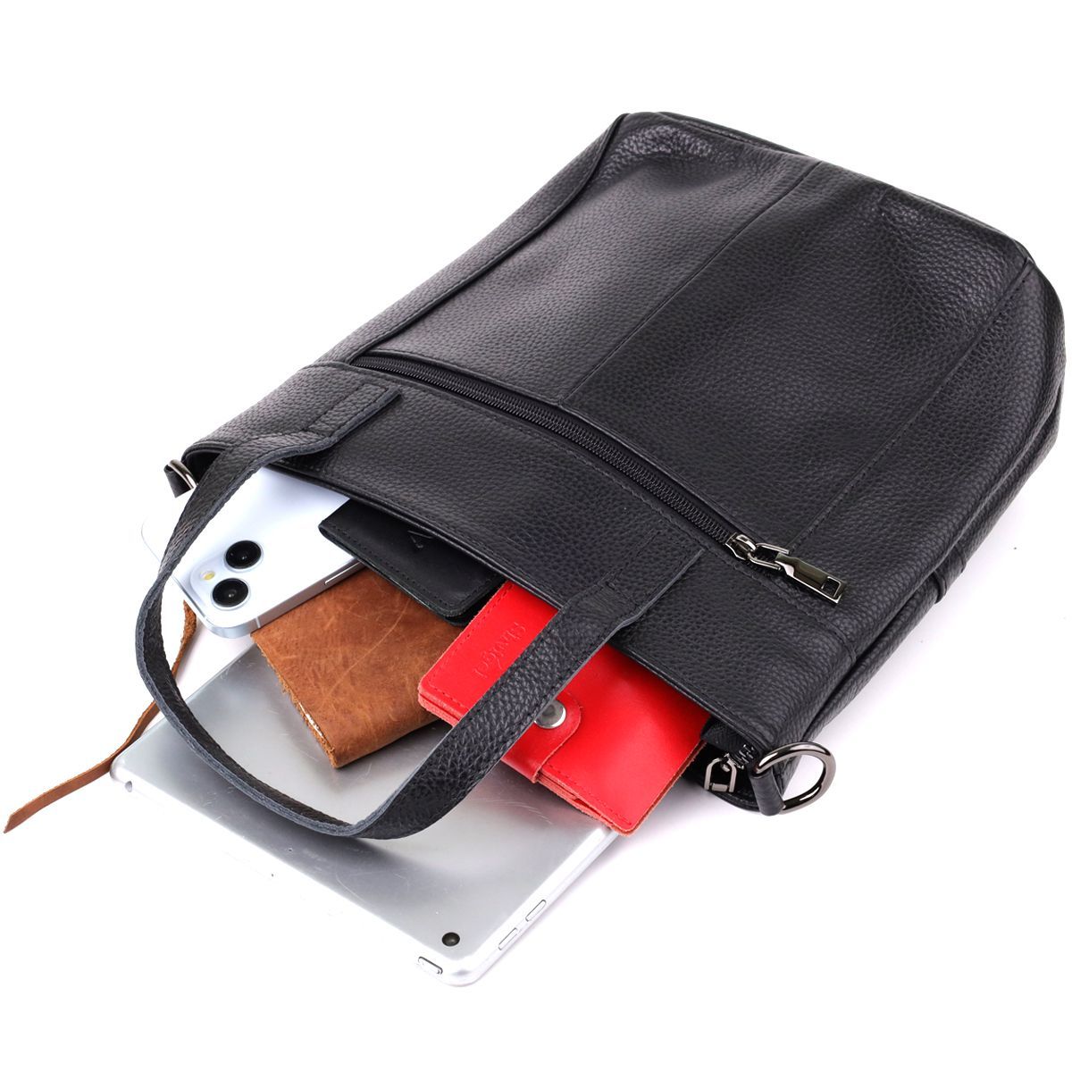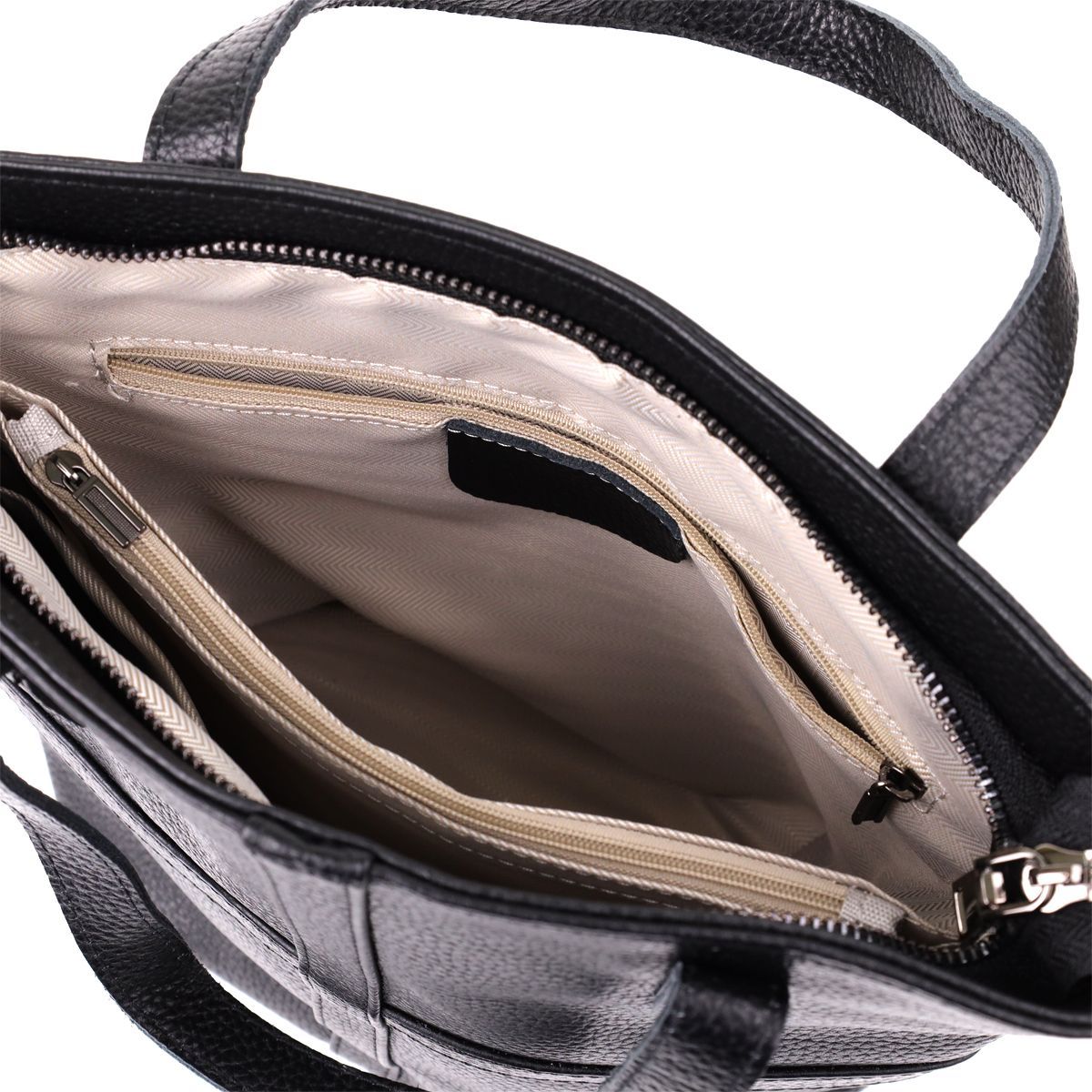 Стильна чорна шкіряна сумка у формі трапеції – це універсальний аксесуар, що поєднує сучасну елегантність та практичність. Вона виконана з натуральної шкіри високої якості, відрізняється щільною структурою та привабливим лаконічним силуетом. Сумка закривається на блискавку і має зручне основне відділення, всередині якого передбачена потайна кишеня на блискавці, кишеня-перегородка на блискавці та відкрита кишеня для дрібниць. Тверде дно допомагає сумці зберігати форму, а фурнітура кольору темного срібла наголошує на вишуканому характері моделі. Для зручності носіння передбачений знімний ремінь, що робить сумку комфортною як у повсякденних, так і більш урочистих образах.