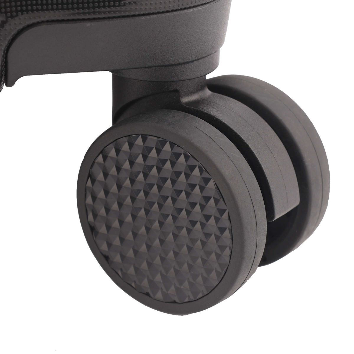 - Подвійні колеса - дана модель оснащена чотирма обертовими на 360 ° здвоєними колесами. Здвоєні колеса забезпечують кращий розподіл ваги та стійкість валізи, відмінне зчеплення, маневреність та мають більшу зносостійкість. Колеса кріпляться гвинтами зсередини, що дозволяє їх замінити у разі зносу.