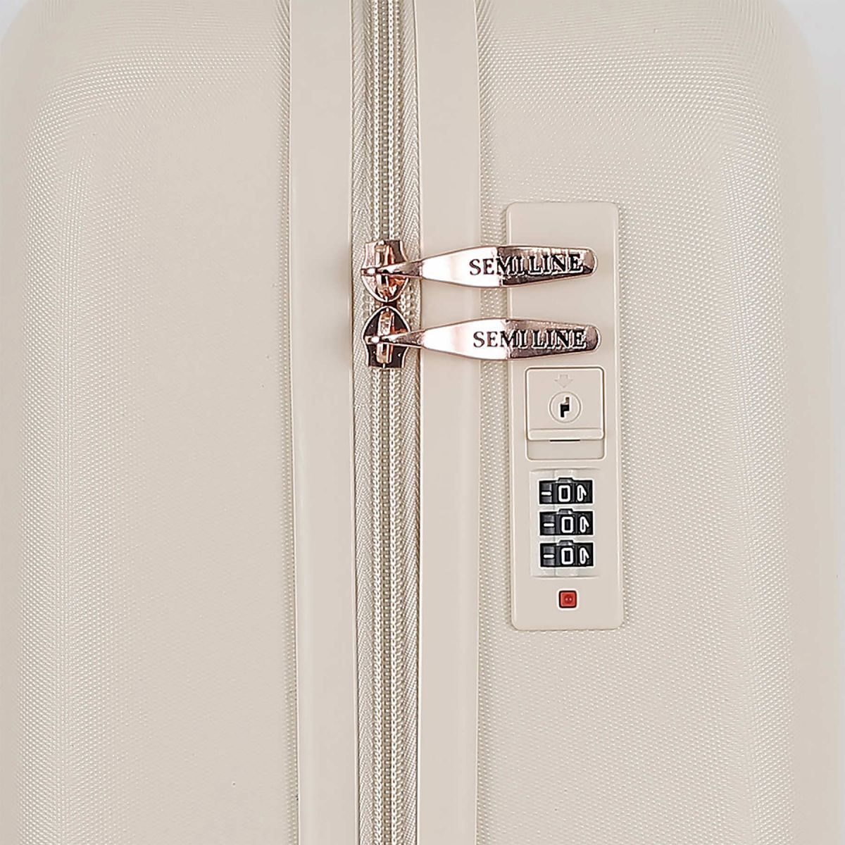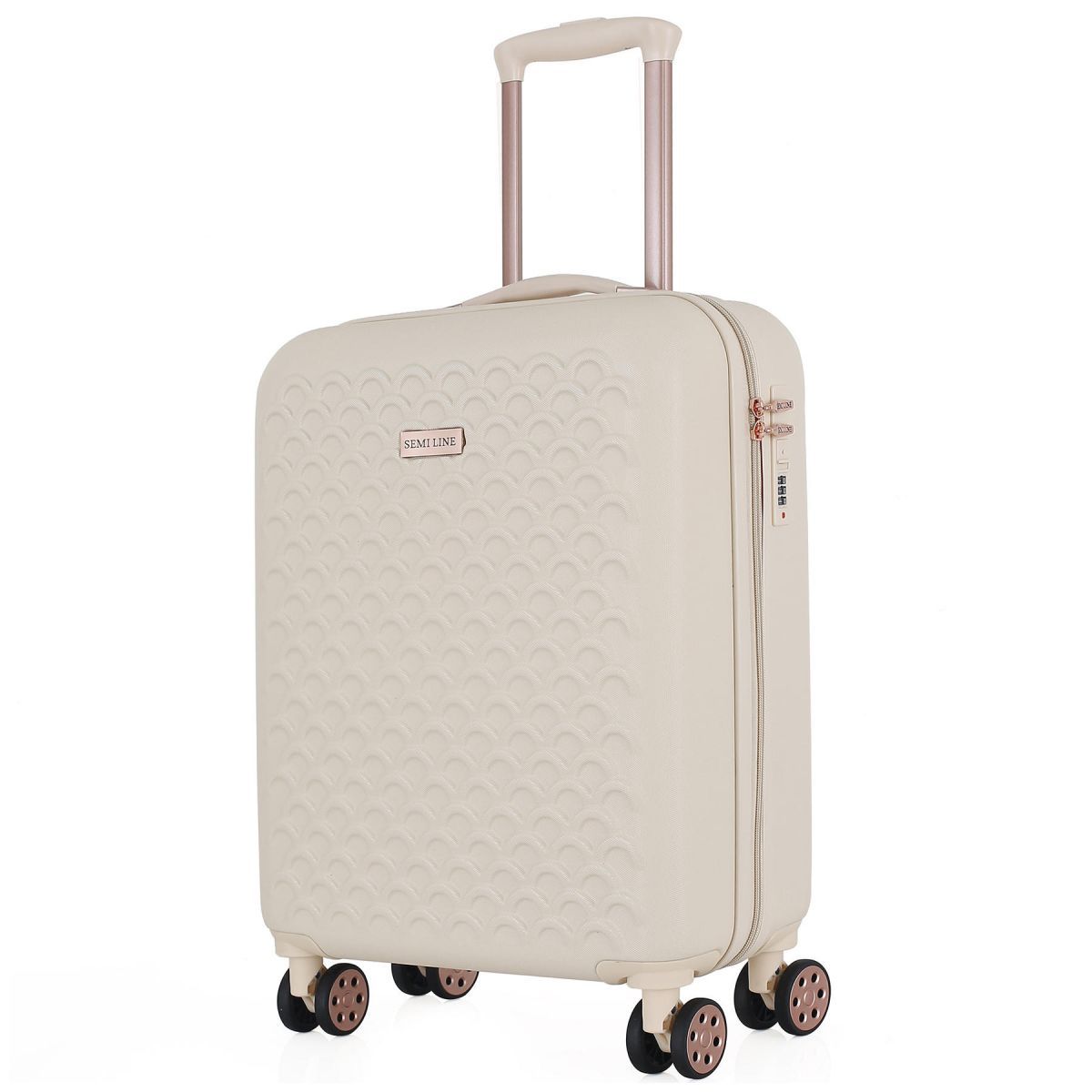 Валіза Semi Line T5791 в сучасному кольорі еркю (колір невідбіленого шовку), з численними металевими і пластиковими вставками під золото, і хвилястим візерунком фасаду виглядає достатньо вишукано. Вона оснащена легкою алюмінієвою телескопічною ручкою, що фіксується в двох положеннях, а ручка для перенесення валізи в руках виконана з приємного на дотик пластику Soft-Touch. "Утоплений" кодовий замок покликаний захистити вміст вашої валізи, а також не виступає над корпусом, отже його неможливо випадково пошкодити при транспортуванні валізи. Semi Line T5791-1 задовольняє вимогам до максимального розміру багажу, що провозиться в якості ручної поклажі в літаках більшості авіакомпаній світу.