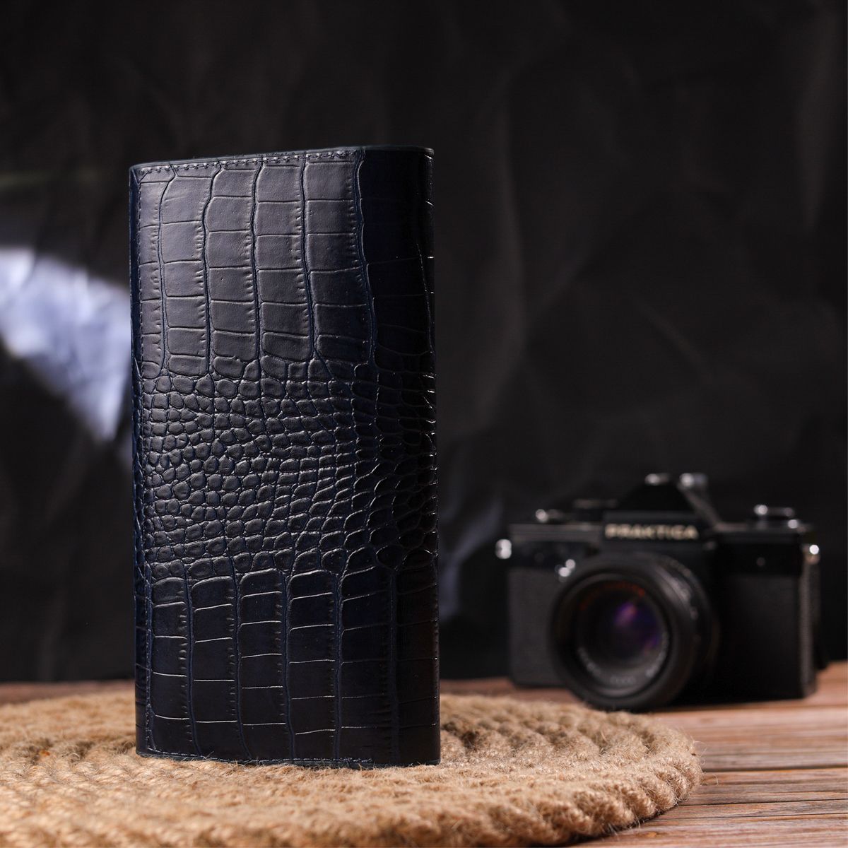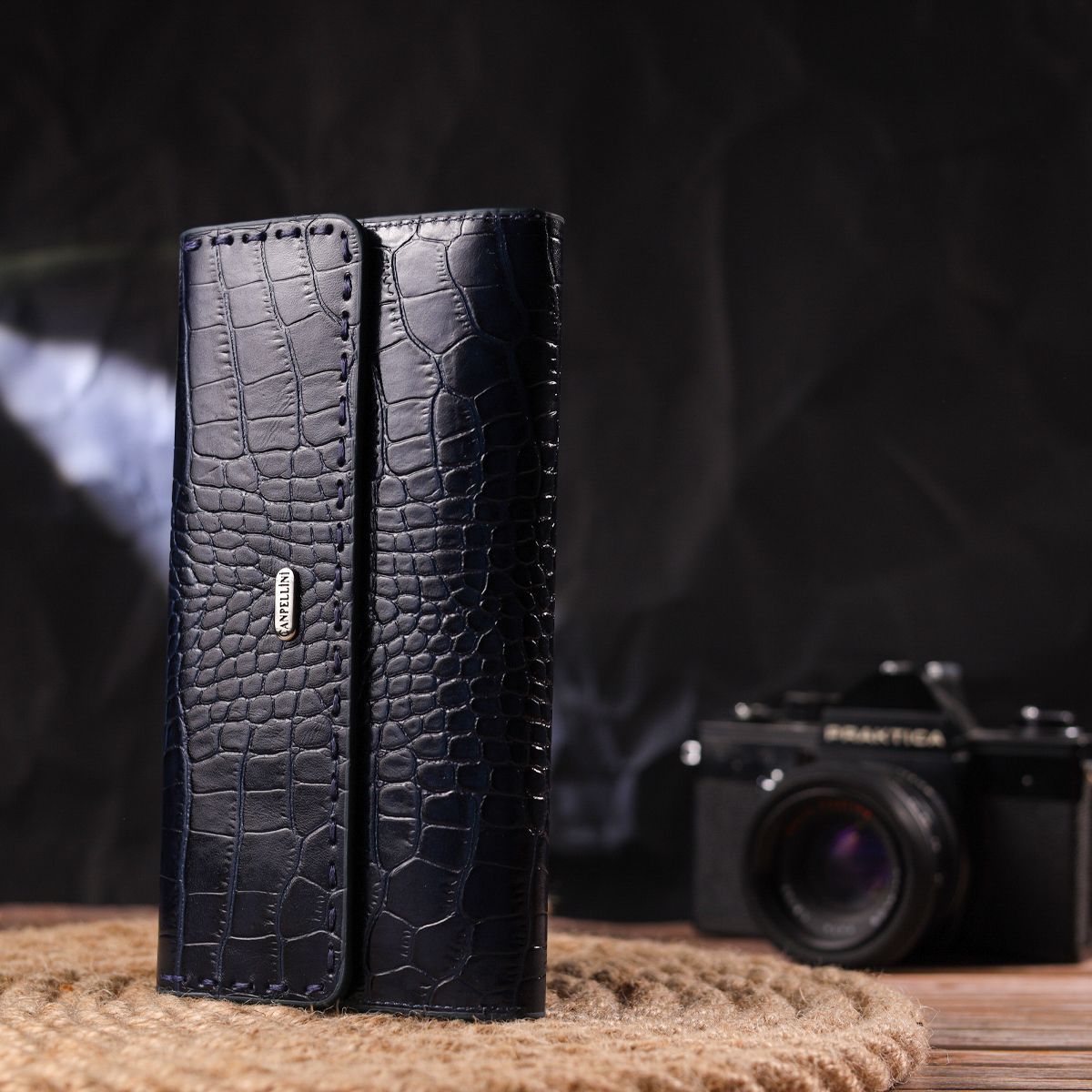 Модний жіночий гаманець, з натуральної шкіри, з тисненням під крокодила. Аксесуар має три відділення для купюр, монетницю, що закривається на блискавку, дві приховані кишені та дванадцять кишень для карток. Закривається аксесуар клапаном на магніти. Краї клапана декоровані рівним прошитим рядком у колір виробу. Якщо Ви хочете порадувати себе та здивувати близьких, то неодмінно купуйте шкіряні аксесуари в нашому магазині, якість і ціна Вас однозначно порадує.
