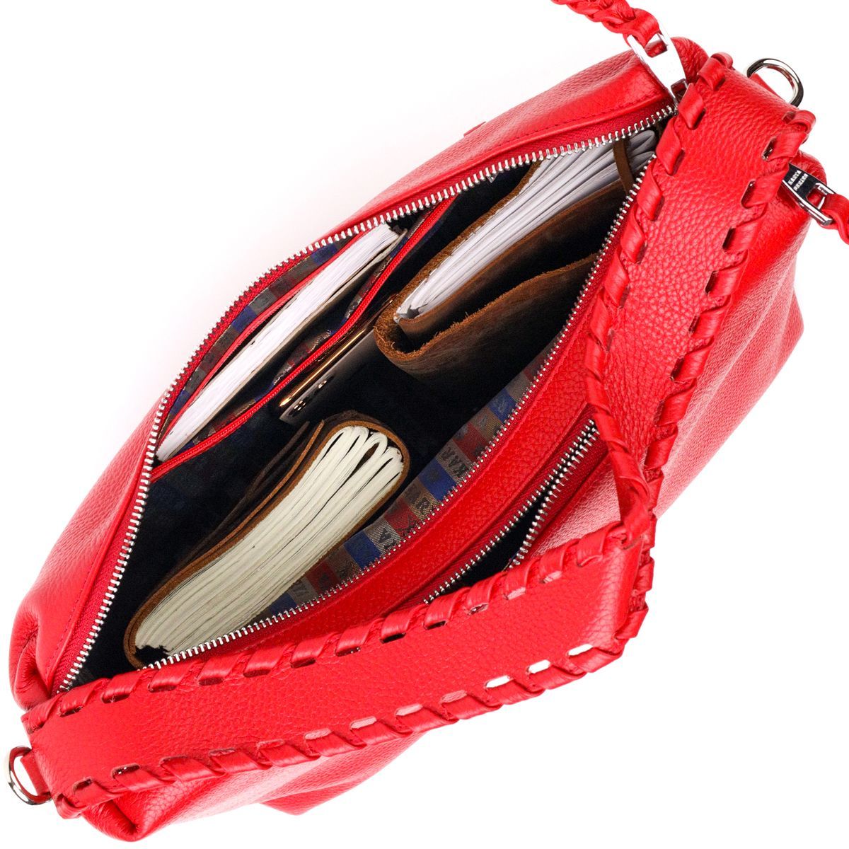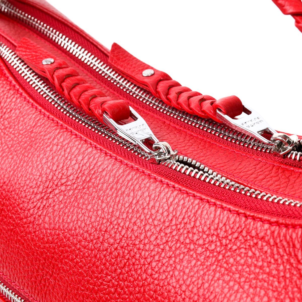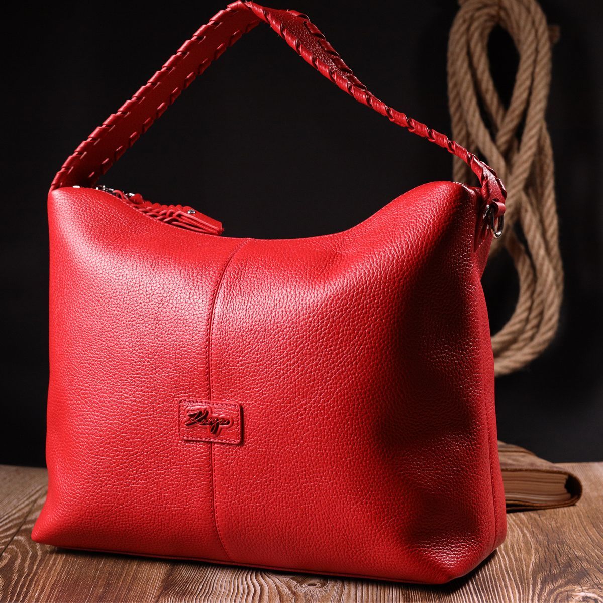 Яскрава містка сумка жіноча з натуральної зернистої шкіри, красивого червоного кольору. Сумка практична та функціональна в експлуатації, якісна фурнітура сріблястого кольору не тільки доповнює стильний дизайн сумки, але й захищає виріб. Аксесуар упакований у фірмовий текстильний мішок Karya. Сумка з натуральної шкіри завжди буде чудовим подарунком будь-якій жінці.
