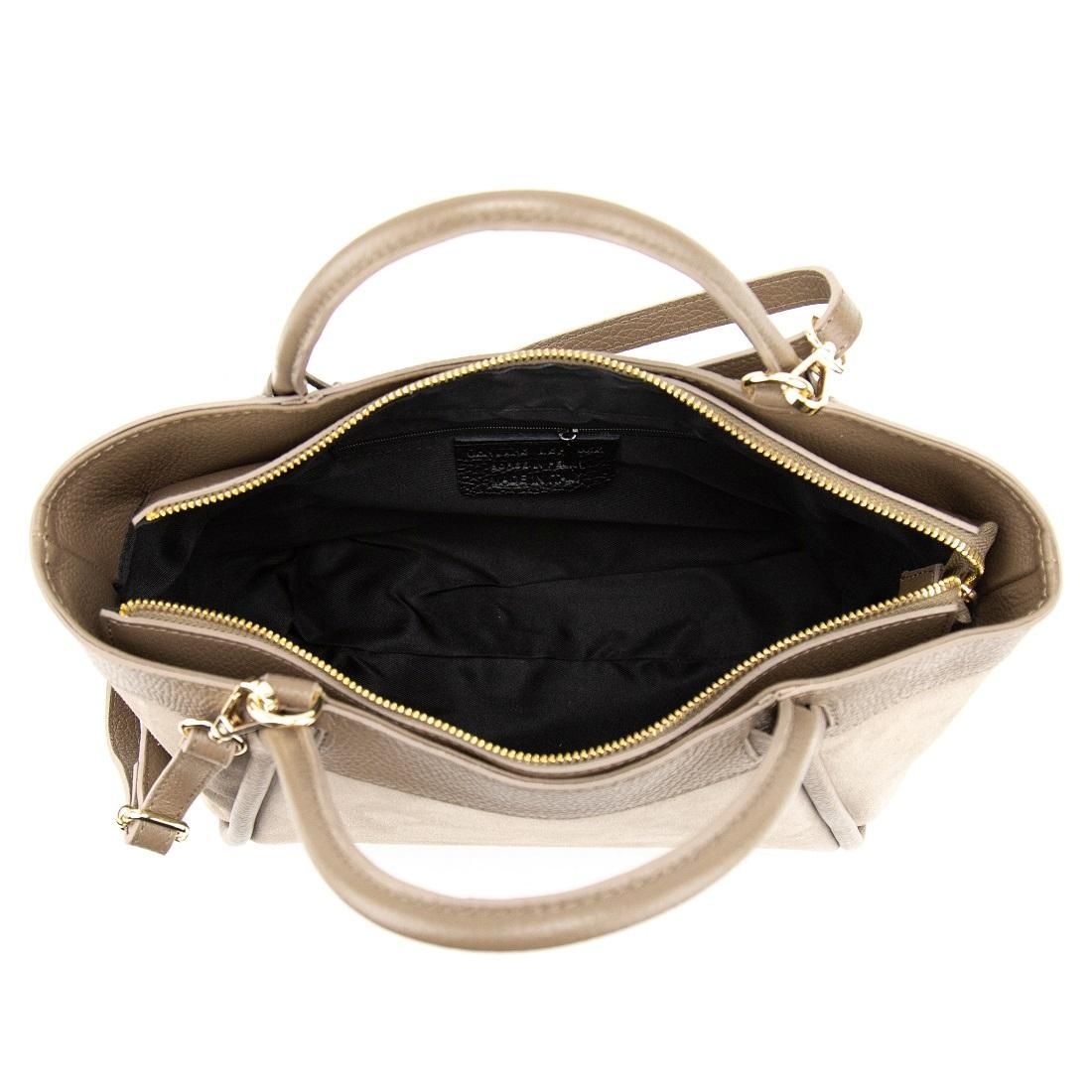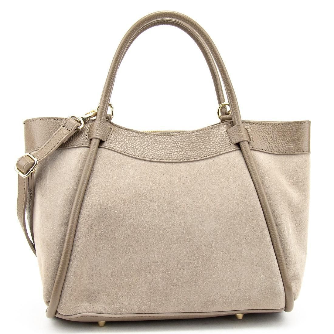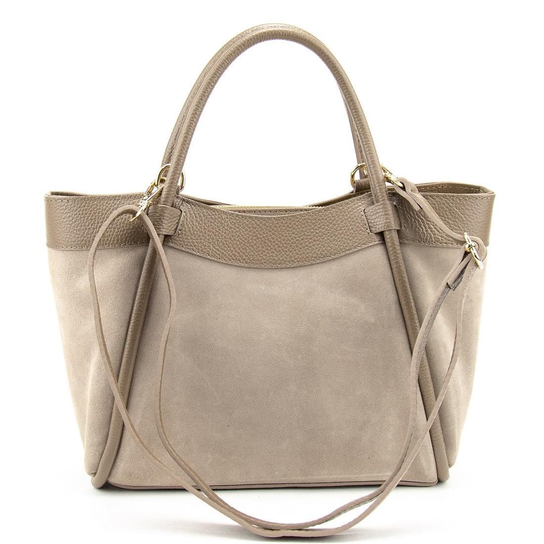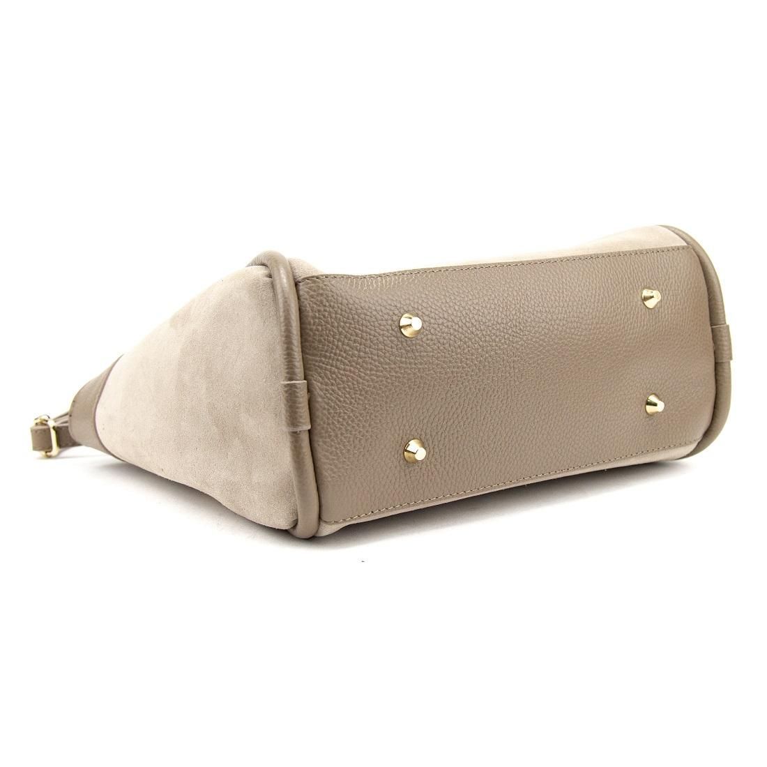 Материалы — натуральная замша и натуральная кожа. Подкладка — текстиль. Цвет изделия — тауп, фурнитура — золотая для утончённого акцента.