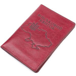 Яскрава обкладинка бордового кольору для військового квитка з патріотичним тисненням карти України на лицьовій стороні. Виріб пошитий із якісної гладкої італійської шкіри із високим показником зносостійкості, яка захистить від пошкоджень документ на дуже довгий час. Аксесуар має розворот для військового квитка, два осередки для карток, без застібки, упакований у фірмовий чохол.