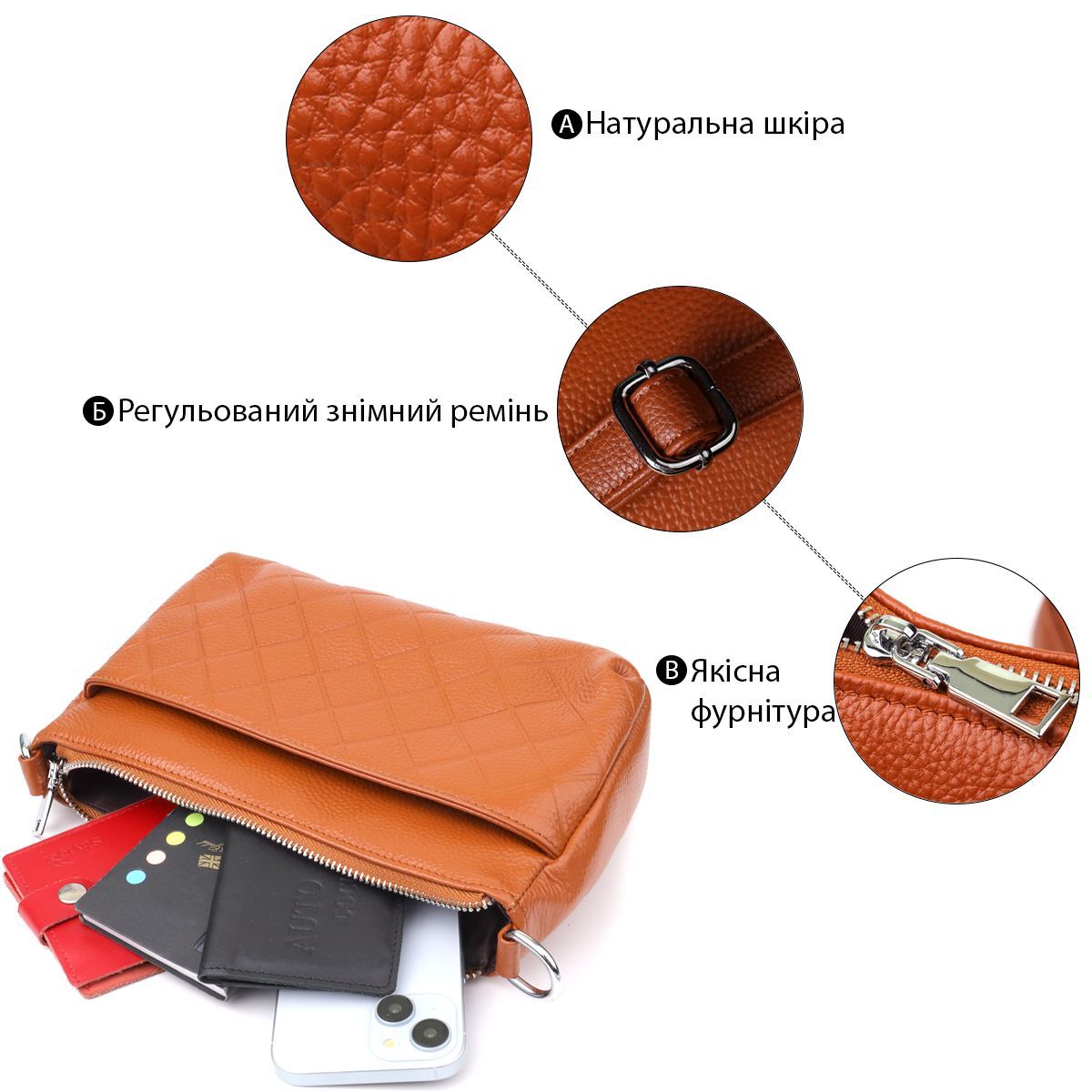 Стильна та практична сумка з натуральної рудої шкіри, яка стане яскравим акцентом у вашому образі. Основне відділення сумки закривається на надійну блискавку, забезпечуючи безпеку ваших речей. Усередині розташована зручна потайна кишеня на блискавці - ідеальне місце для зберігання цінних дрібниць, і кишеня відкритого типу для швидкого доступу до необхідних предметів.