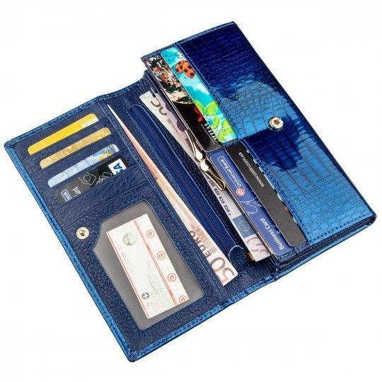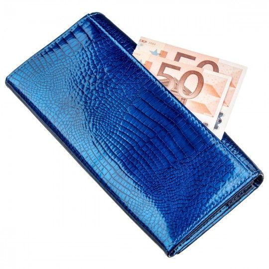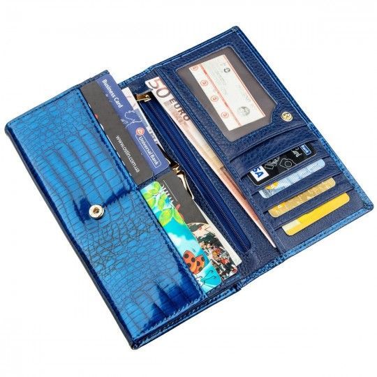 Вишуканий жіночий гаманець у класичному стилі для жінок будь-якого віку. Зроблений аксесуар з натуральної першосортної шкіри, яка м'яка та гладка на дотик, а також покрита лаком. Тому виглядає виріб дуже красиво та фешенебельно. Колір гаманця – насичено синій із блакитним відливом. Наповнення гаманця теж можна сказати-класичне. Це відділення для купюр та банкнот, для необ'ємних документів, відділення для монет та іншої дрібниці, а також кишені для візитних та кредитних карток. Динний аксесуар неодмінно стане чудовим подарунком не тільки самій собі, але й для іншої близької людини, особливо якщо є привід. Упаковка представлена у вигляді щільної фірмової картонної коробки.