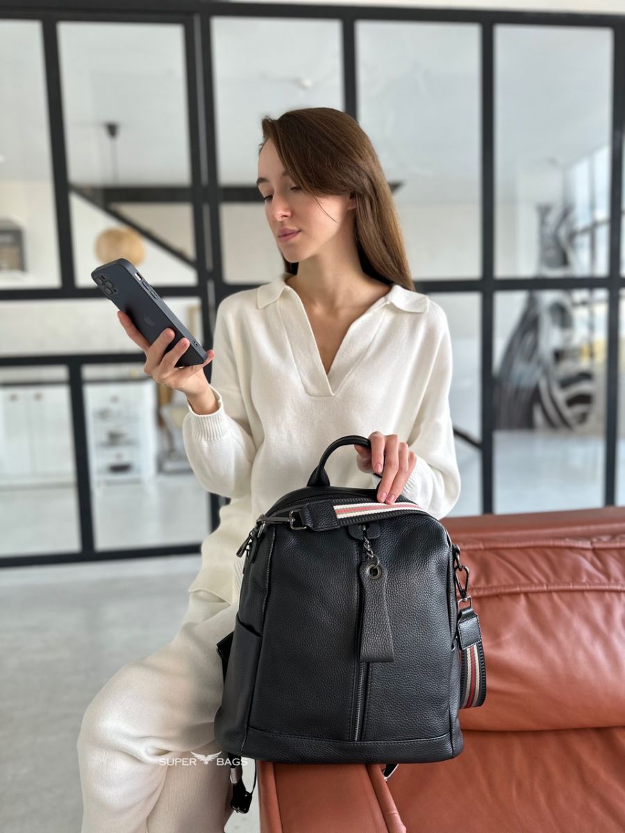 Стильний аксесуар для дівчат і жінок, необхідний для повсякденного життя, яка стає динамічнішою, активнішою та швидкіснішою. У такий практичний і функціональний рюкзак дасть змогу розмістити багато різноманітних речей. Виготовлений із натуральної шкіри, у практичному чорному кольорі, який буде доречний у будь-якій колірній гамі гардероба. Вміщує документи формату А5.