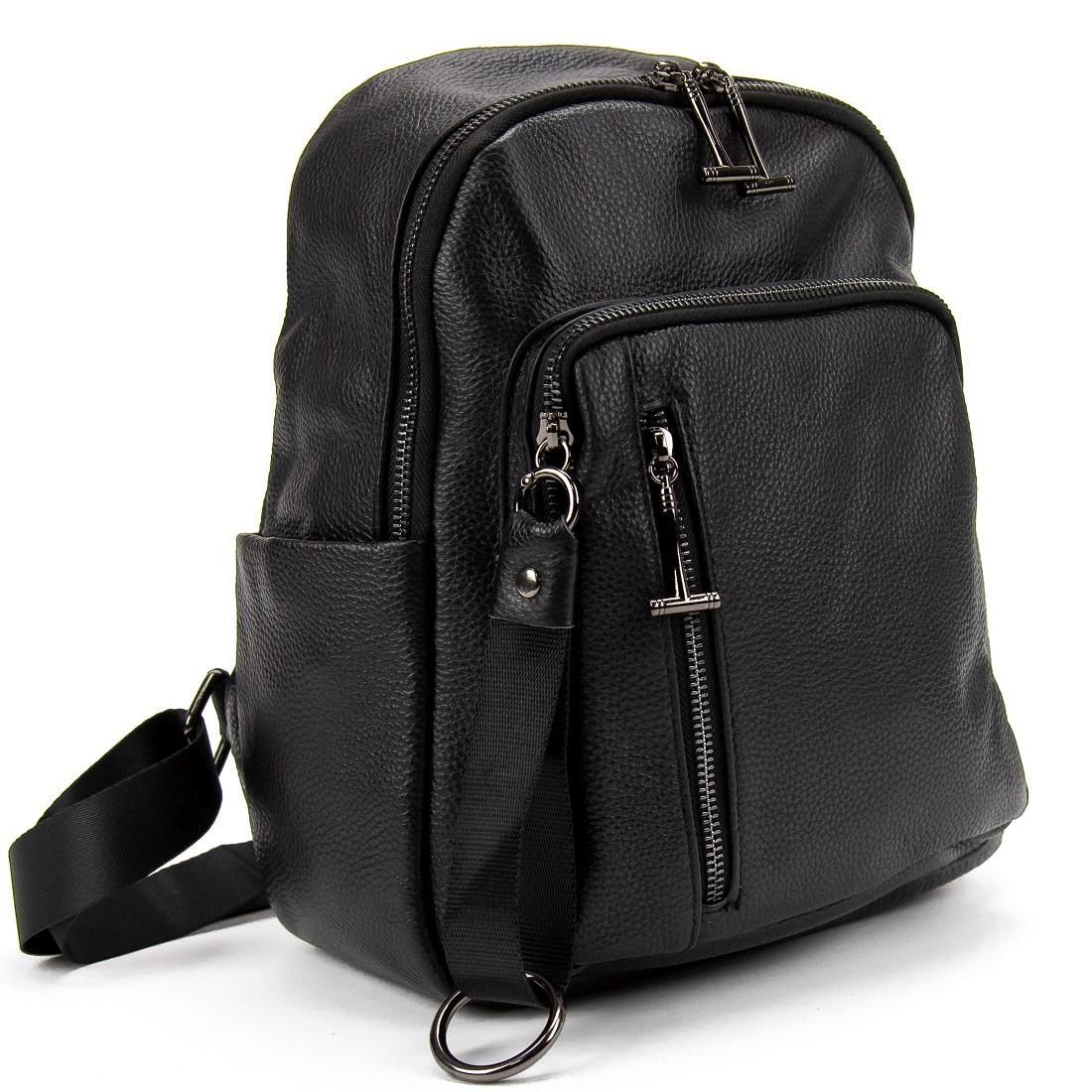 Рюкзак Olivia Leather A25F-FL-89206A пошитий із телячої шкіри, зернистої фактури, в чорному кольорі. Розміри: 25 x 11 x 30 см. Виріб має два основні незалежні відділення на блискавках, різних розмірів. Усередині рюкзака є кілька додаткових кишеньок – на змійці, відкритий слот, та кишеня-перегородка на блискавці. Зовні розташована одна вертикальна кишеня на блискавці з лицьового боку, і одна горизонтальна з тильного боку. Також по обидві торцеві сторони є нашивні слоти відкритого типу. Наплечні ремені виконані в комбінації шкіри з текстильною стрічкою. Підкладка: текстиль. Колір: чорний. Колір фурнітури: темне срібло.