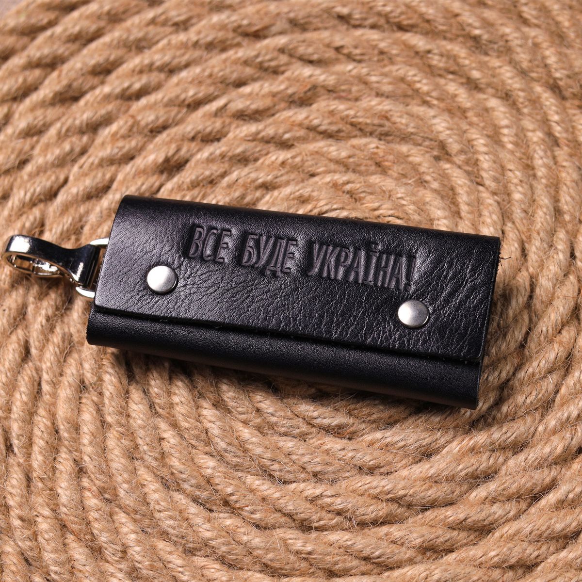 Надійна шкіряна ключниця на кнопках, з патріотичним тисненням на лицьовій стороні “Все буде Україна”. Виріб пошитий з гладкої шкіри, з високими показниками зносостійкості. В аксесуарі використана надійна фурнітура, кольору срібла. Вироби зі шкіри завжди вважалися відмінним подарунком, незалежно від статі та віку.