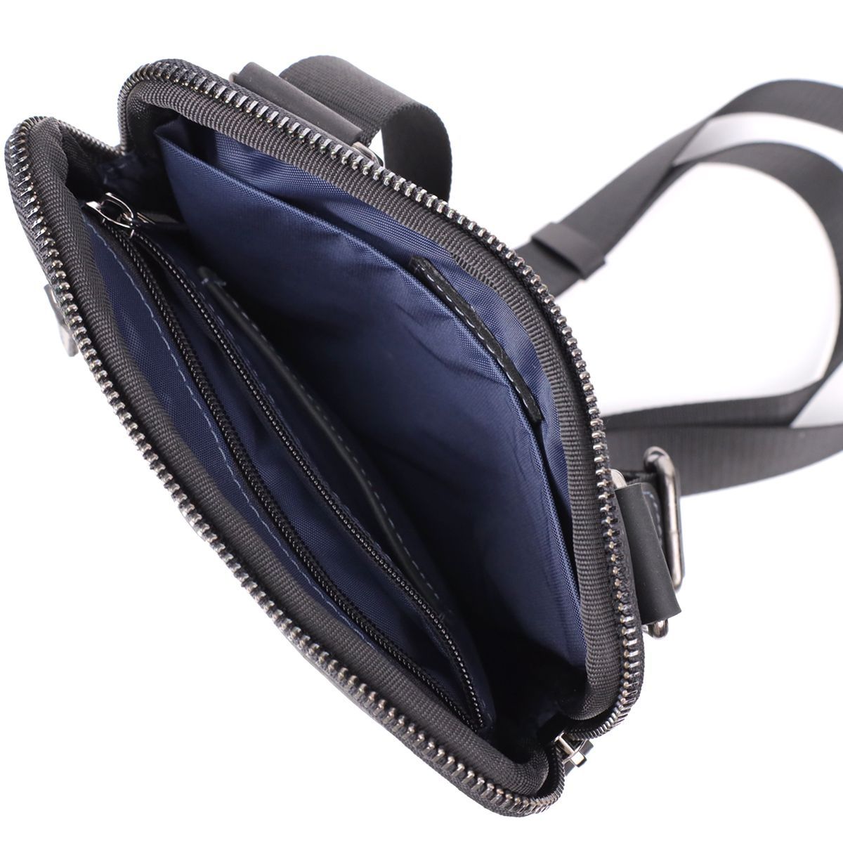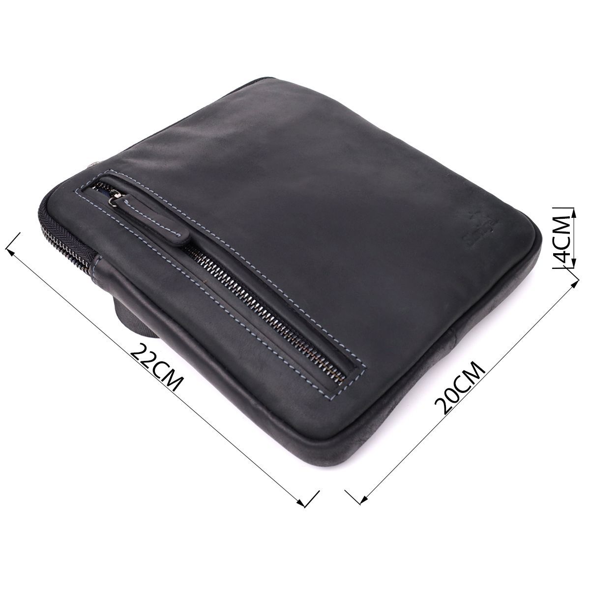 Компактна чоловіча вертикальна сумка SHVIGEL виконана з натуральної вінтажної шкіри з декоративним синім рядком по контуру. Лаконічний дизайн у поєднанні з функціональною організацією простору робить її зручним аксесуаром для повсякденного використання.