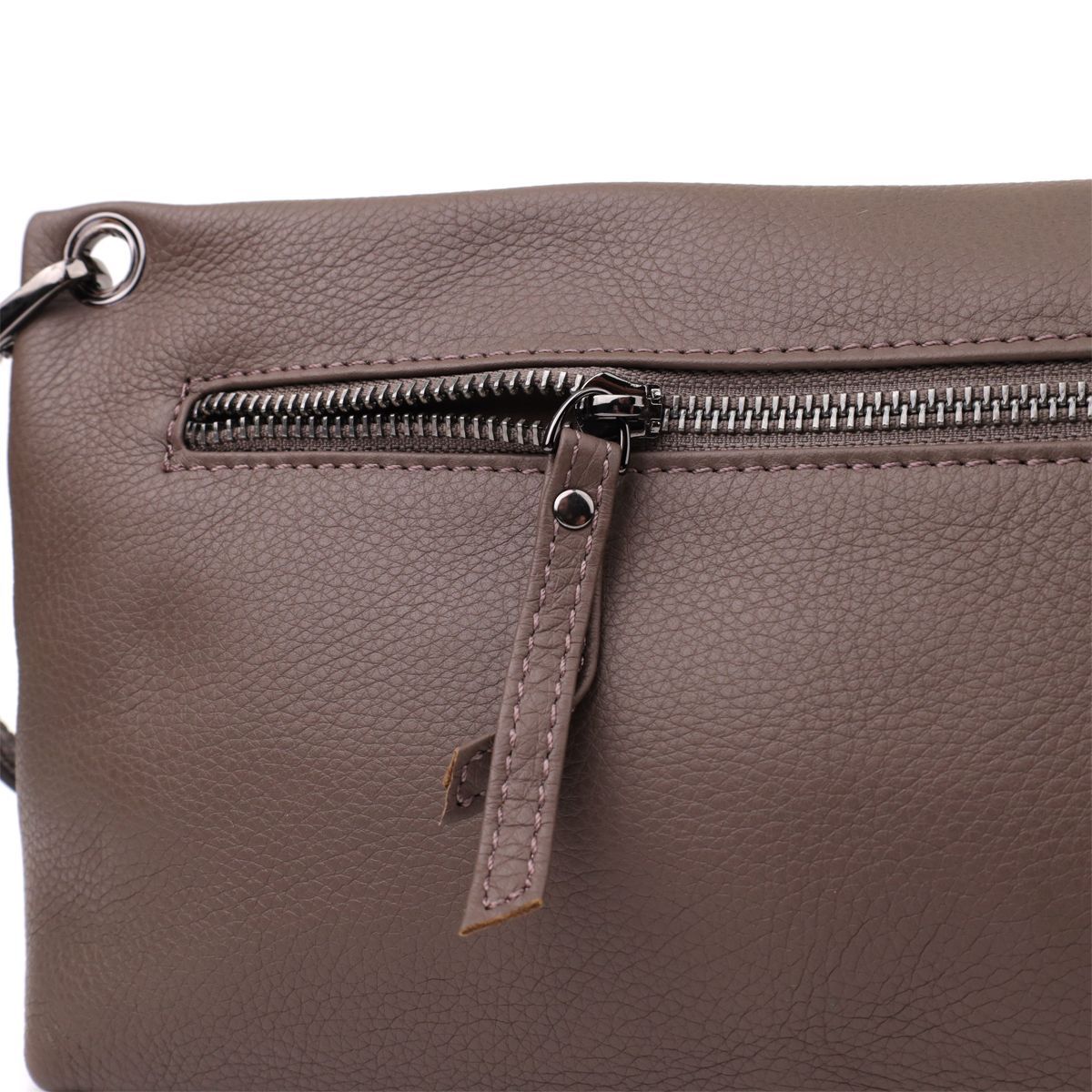 Фурнітура кольору срібла гармонійно поєднується з теплим відтінком шкіри, підкреслюючи витонченість аксесуара. Знімний шкіряний ремінець дозволяє носити клатч у руці або на плечі.