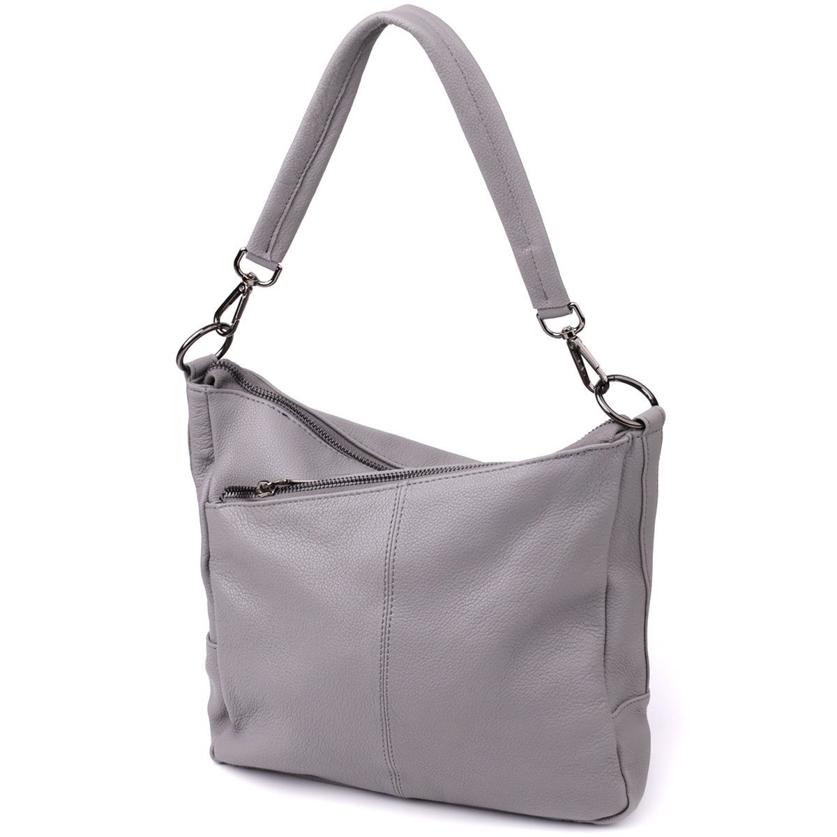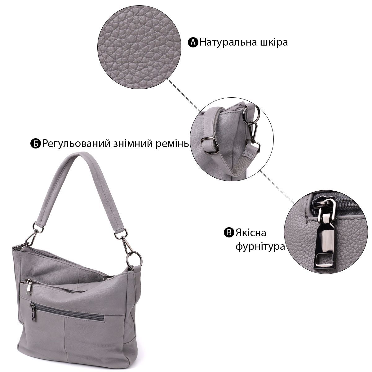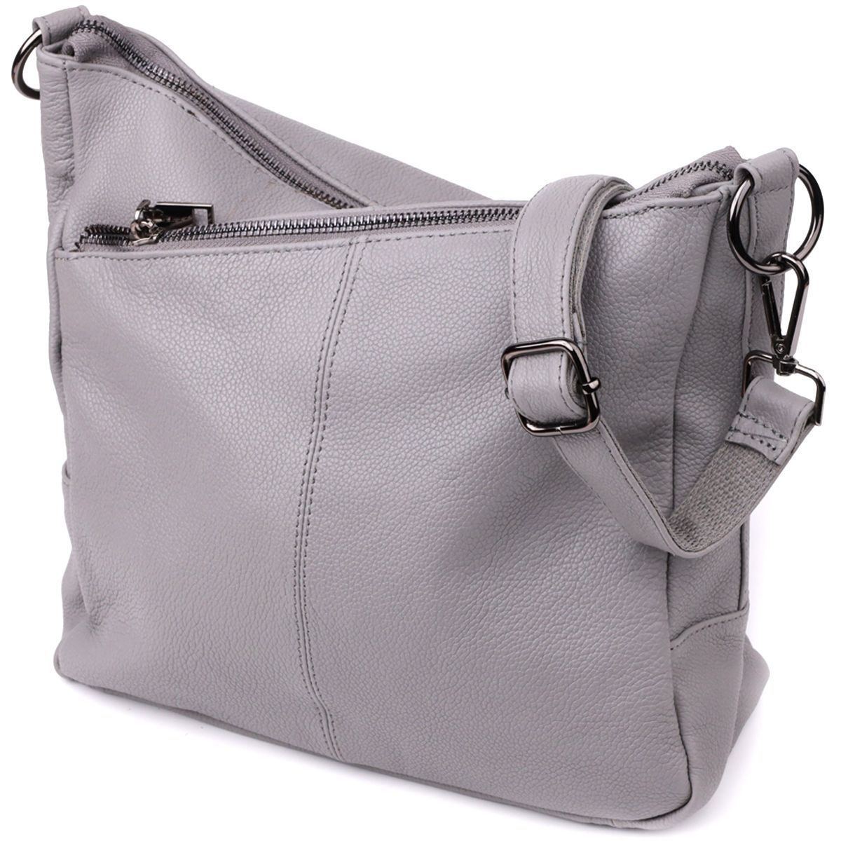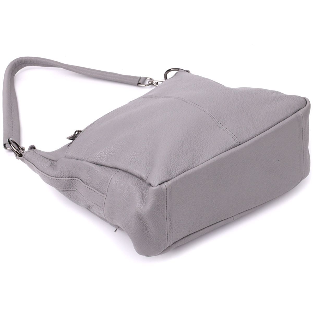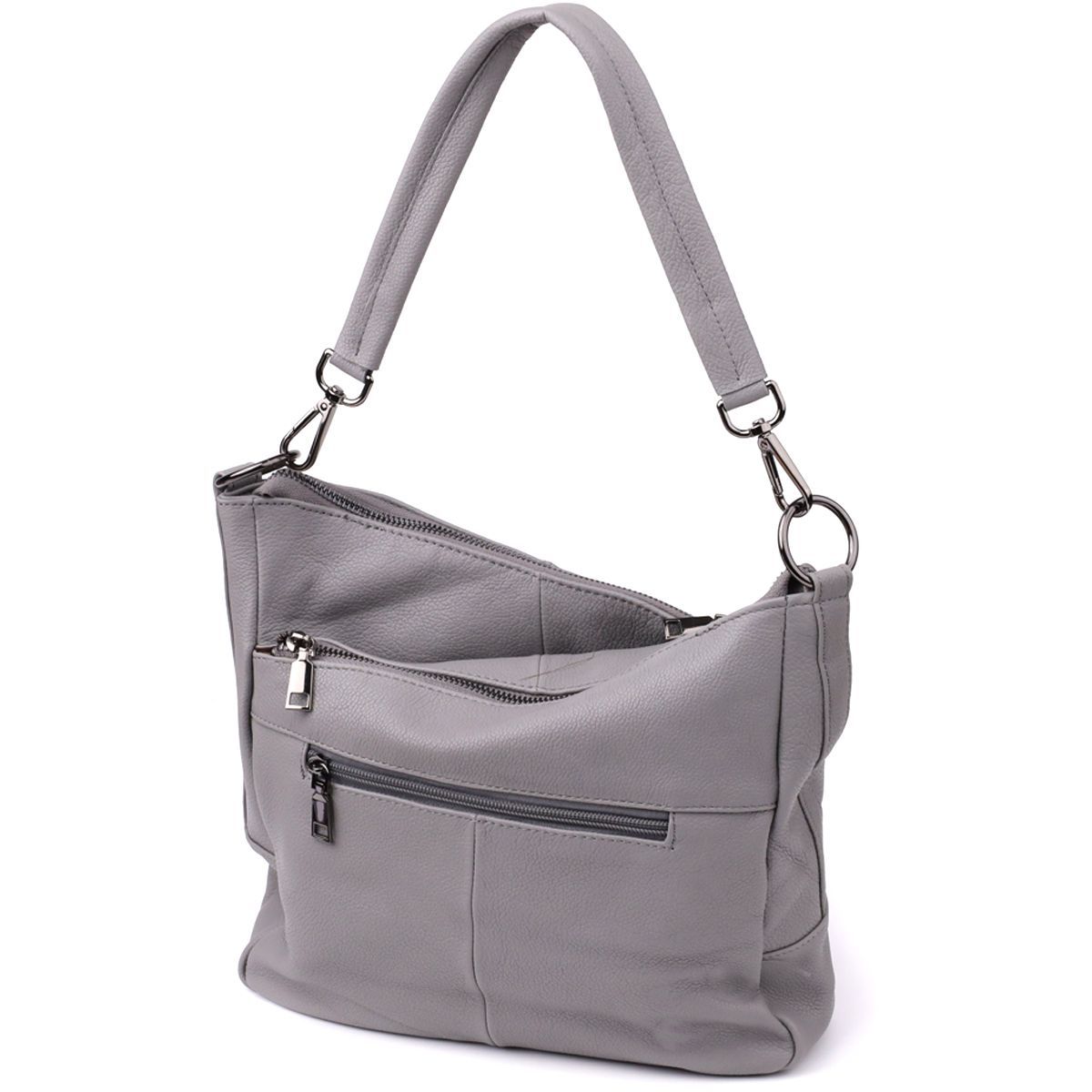 Сіра шкіряна сумка з трьома відділеннями – це витончений акцент у вашому образі та надійний супутник на кожен день.