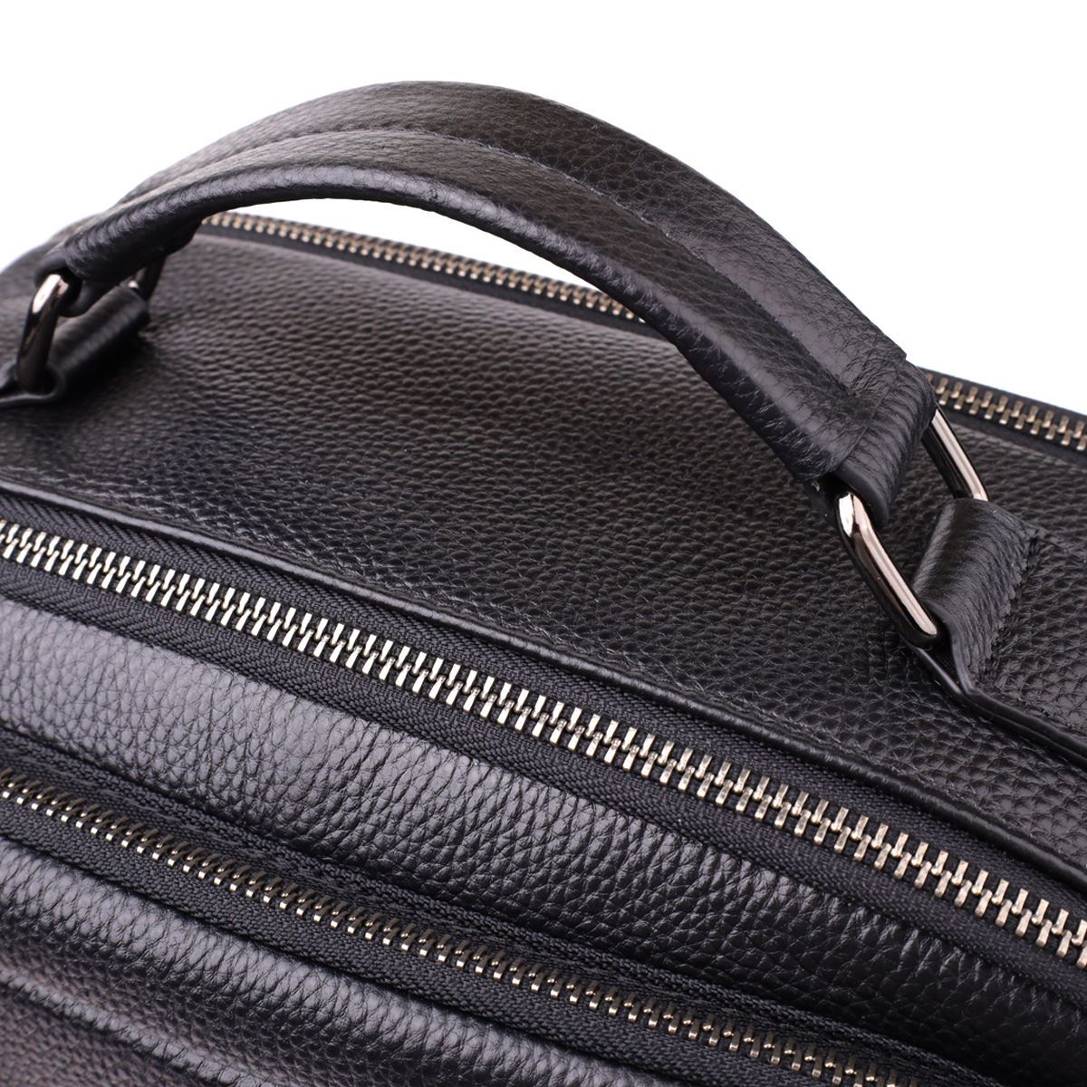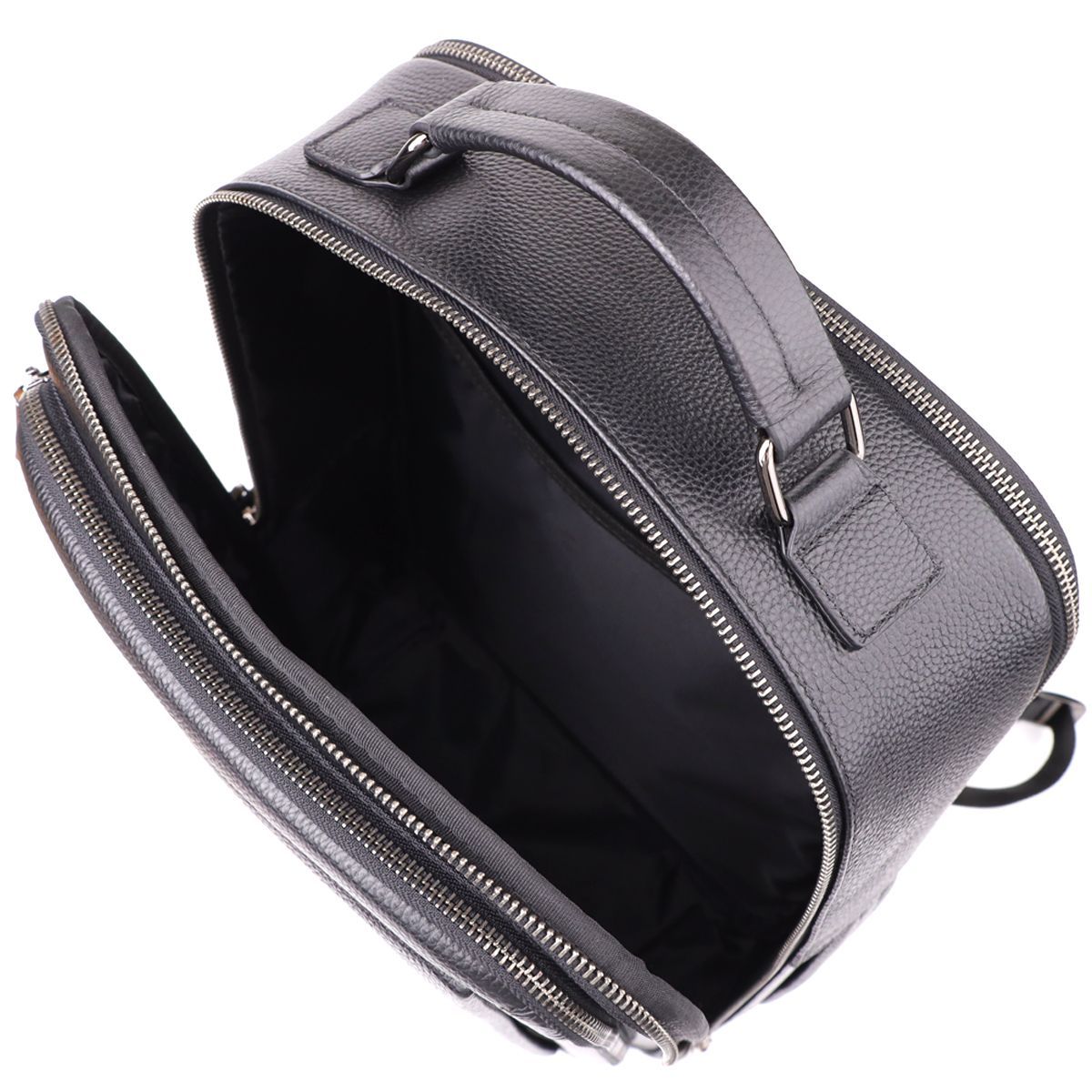 Для комфортного перенесення передбачені дві шкіряні ручки - зверху та збоку, а м'які регульовані лямки та ортопедична спинка гарантують зручність навіть при тривалому використанні. Фурнітура темного срібла підкреслює стриманий та елегантний образ рюкзака, роблячи його універсальним аксесуаром для міста, роботи та подорожей.