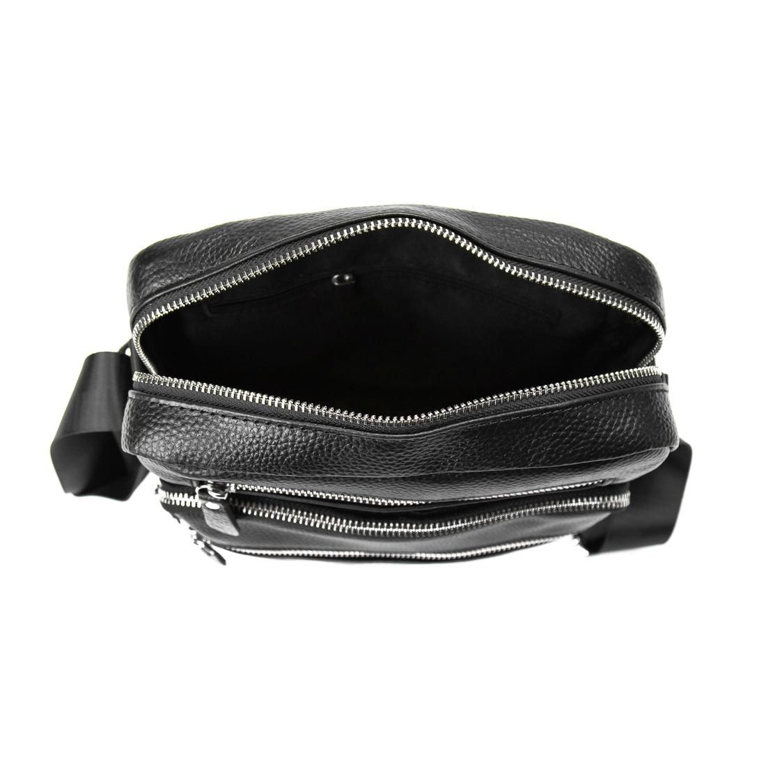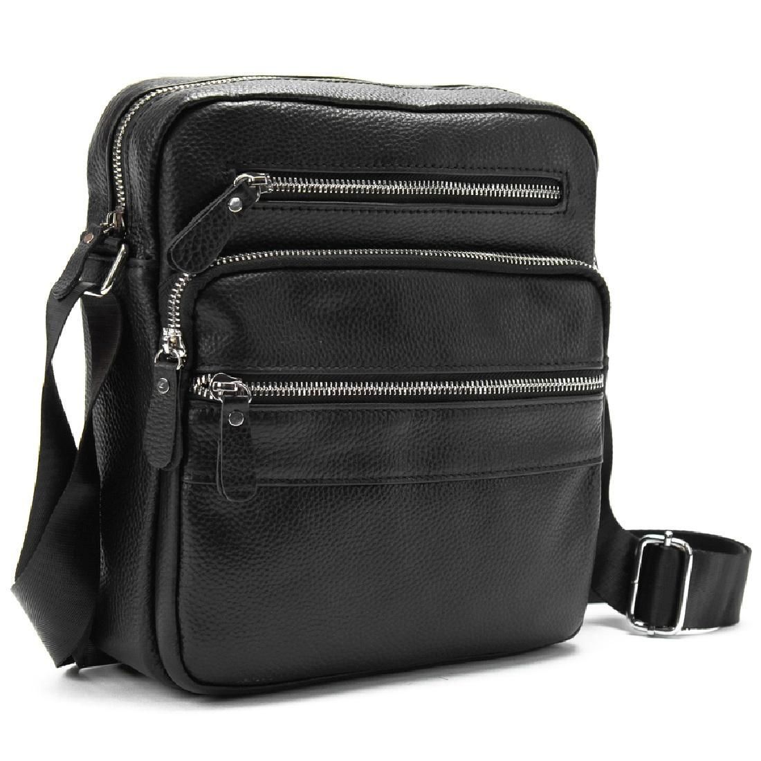 Сумка через плече Tiding Bag M56-9981A з натуральної шкіри в чорному кольорі, зернистої фактури. Розмір: 21 x 7 x 25 см. Чоловіча шкіряна сумка чорного кольору. Поверхня шкіри має зернисту структуру. Плечовий ремінь регулюється за довжиною. Одне велике основне відділення, є потайна кишеня на блискавці. З лицьового боку є три додаткові кишені на блискавці, з тильного боку також є кишеня на блискавці. Підкладка: текстиль. Колір: чорний. Колір фурнітури: срібло.