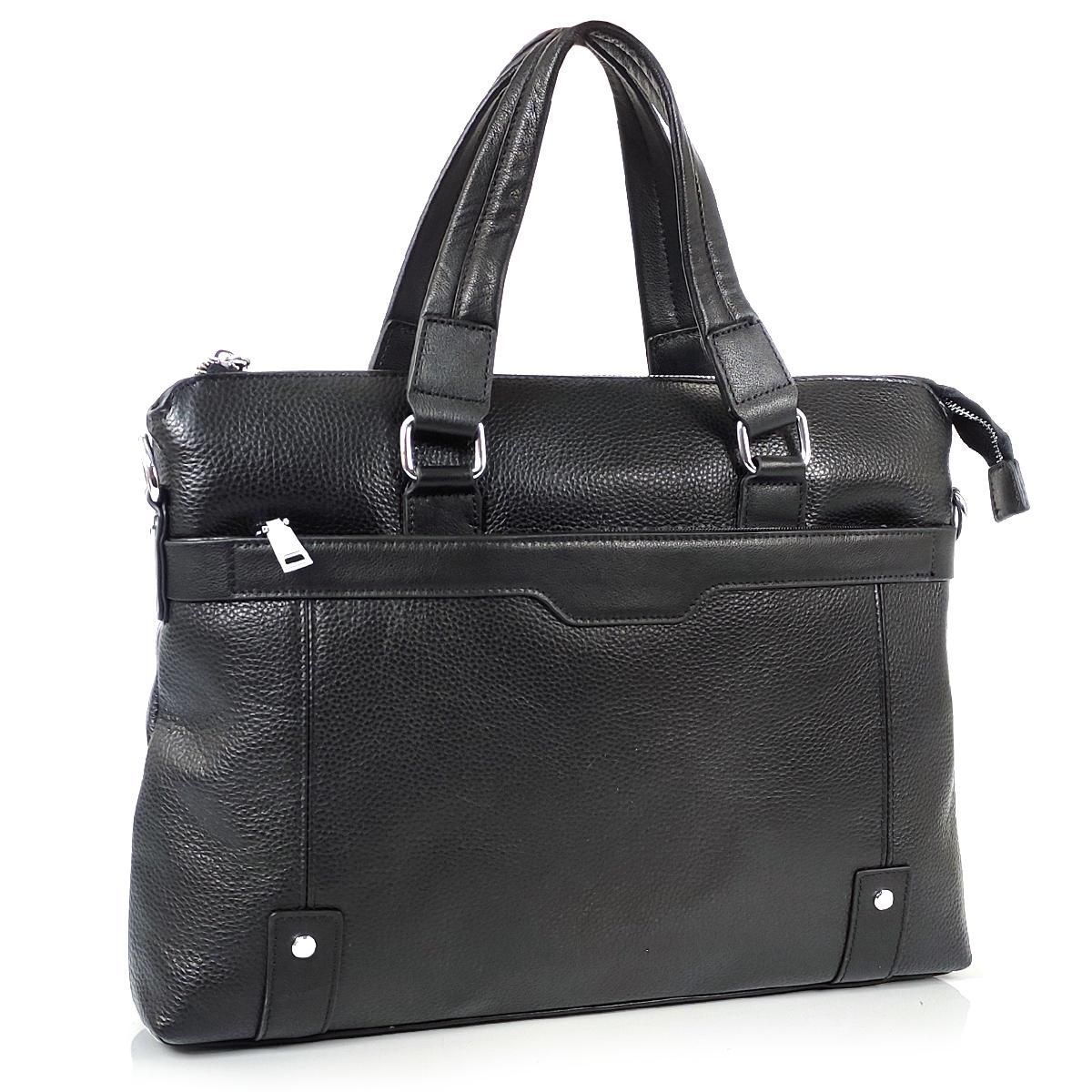 Стильна чоловіча сумка для ноутбука Tiding Bag F-A25F-17637A виготовлена з натуральної шкіри чорного кольору і має матову, зернисту текстуру. Особливості: розміри сумки становлять 37 х 28 х 6 см. Сумка має одне відділення, яке закривається на блискавку. Всередині розташована велика кишеня для ноутбука, яка фіксується на липучку і збоку розташована невелика кишеня на блискавці. З передньої частини аксесуара розташована кишеня на блискавці розміром 28х19 см. З задньої частини сумки є кишеня для дрібниць розміром 28х16 см. Стильний аксесуар легко вміщує документи формату А4, планшет, ноутбук. Сумка міцна добре тримає форму. Підкладка – текстиль. Текстильний плечовий ремінь регулюється по довжині, в діапазоні 85-150 см і легко може бути відстебнутий. Ручки шкіряні, м'які, їхня висота становить 18 см. Колір чорний. Колір фурнітури: срібло.