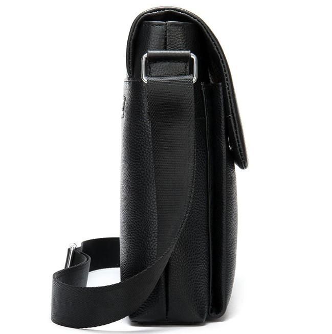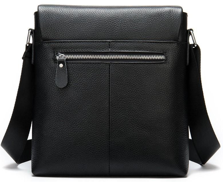 Чоловіча шкіряна сумка Tiding Bag A25-1278A виготовлена з натуральної шкіри чорного кольору і має зернисту структуру. Особливості: має одне основне відділення вертикального типу яке закривається на блискавку з клапаном на магнітних кнопках. Розміри сумки становлять 24 х 28 х 6 см. Всередині головного відділення є три кишені, дві з яких відкритого типу і одна кишеня на блискавці з розміром 15х12 см. Поза головного відділення з передньої частини є кишеня відкритого типу розміри якої становлять 18х18 см. Кишеня захована під клапаном, який фіксується на магнітні кнопки. З задньої частини аксесуар має кишеню розміром 17х11 см яка закривається на блискавку. Месенджер має м'яку структуру. Підкладка - текстиль. Плечовий ремінь регулюється по довжині, в діапазоні 70-140 см. Колір: чорний. Колір фурнітури: срібло.