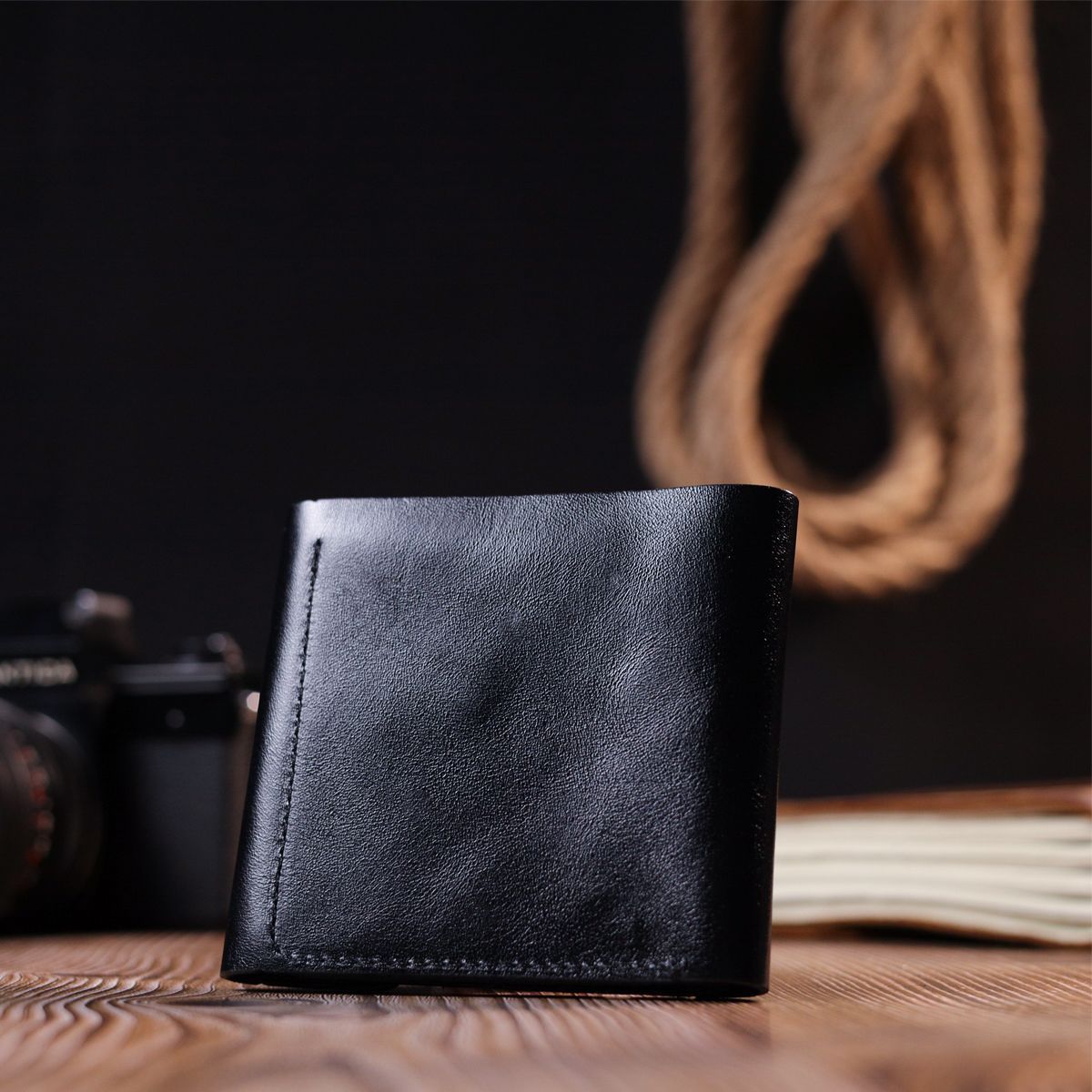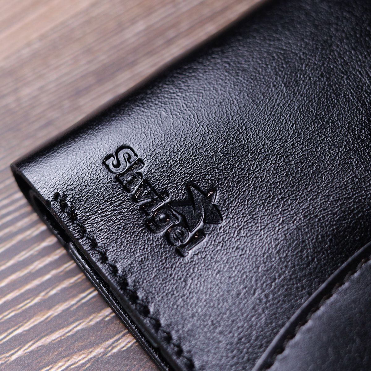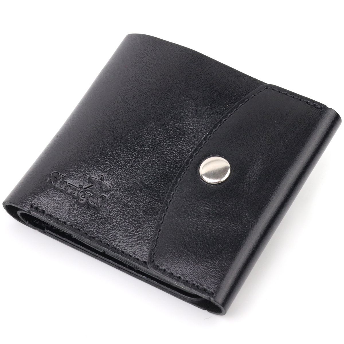 Компактный кошелек черного цвета, маленького размера, который легко поместится даже в малейшую сумку. Аксессуар не займет много места и не имеет лишнего веса. Закрывается кошелек с кнопкой. Снаружи и внутри изделие сделано из натуральной глянцевой кожи. На лицевой стороне кошелек украшен тисненым логотипом Shvigel. Добротная натуральная кожа прослужит очень долго.