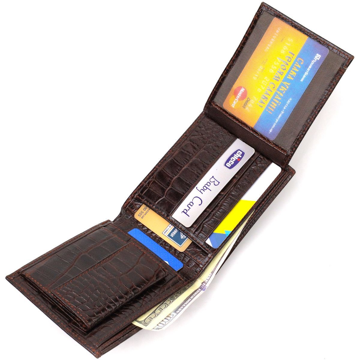 Прекрасный мужской кошелек в красивом коричневом цвете, из натуральной кожи с тиснением под крокодила. Аксессуар имеет одно основное отделение с перегородкой, в которое помещаются купюры всех номиналов, четыре кармана для карточек, два кармана под сеточкой для документов, монетницу и три близлежащих кармана. Закрывается аксессуар пополам без застежки. Упакованный бумажник картонную коробку. Кожаный кошелек является отличным подарком для родных и близких людей.