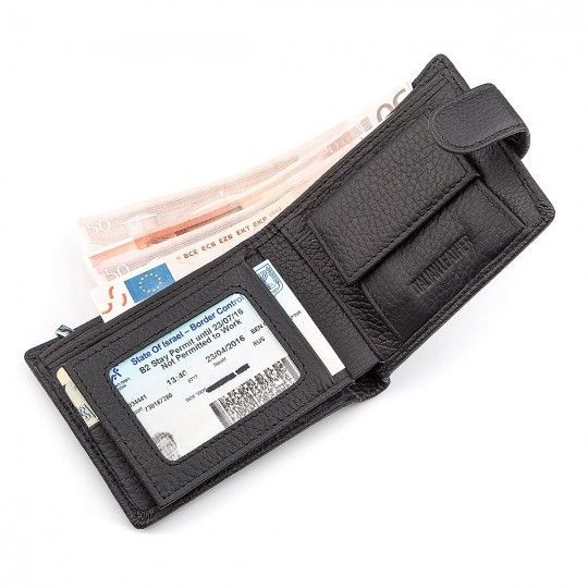 Данная модель отличный вариант для любителей переносить кошелек в заднем кармане брюк. Она отличается компактностью и функциональностью. Фиксация производится благодаря кнопке. Такое изделие поможет разместить самые нужные вещи: деньги, кредитки, ID-карты и даже небольшое количество монет. Изготовлен кошелек из натуральной черной кожи. На лицевой стороне аксессуара изображены брендовый, новый знак и лаконичная строчка по краю. Выглядит кошелек стильно и современно. Наш интернет магазин позволяет приобрести аксессуары с возможностью оформления доставки по территории всей страны.
