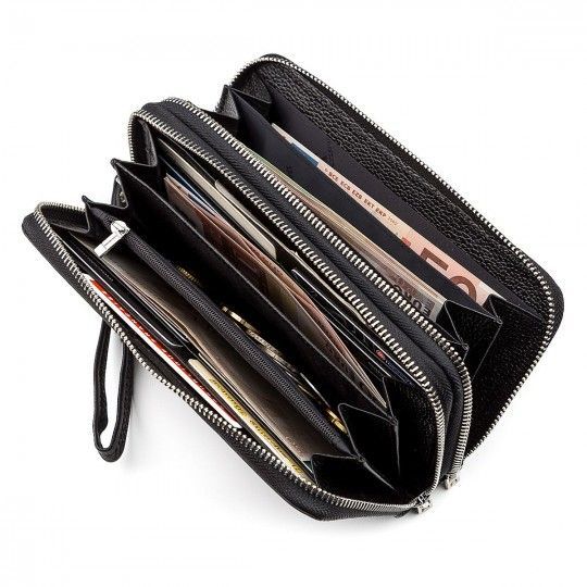 Данная модель производится в классическом стиле и солидном черном цвете. Для максимального удобства кошелек разделен на два больших отделения, внутри которых можно без проблем размещать бумажные банкноты, банковские карты и даже смартфон. По бокам есть дополнительные отделения и секции для дисконтных карточек, а благодаря качественной, натуральной коже аксессуар приятно чувствуется в руках и не доставляет дискомфорта при ношении. Есть также ручка для ладони и ремешок для запястья. Эта модель и многие другие можно приобрести на сайте нашего интернет-магазина, который предлагает качественные изделия по приемлемой стоимости.