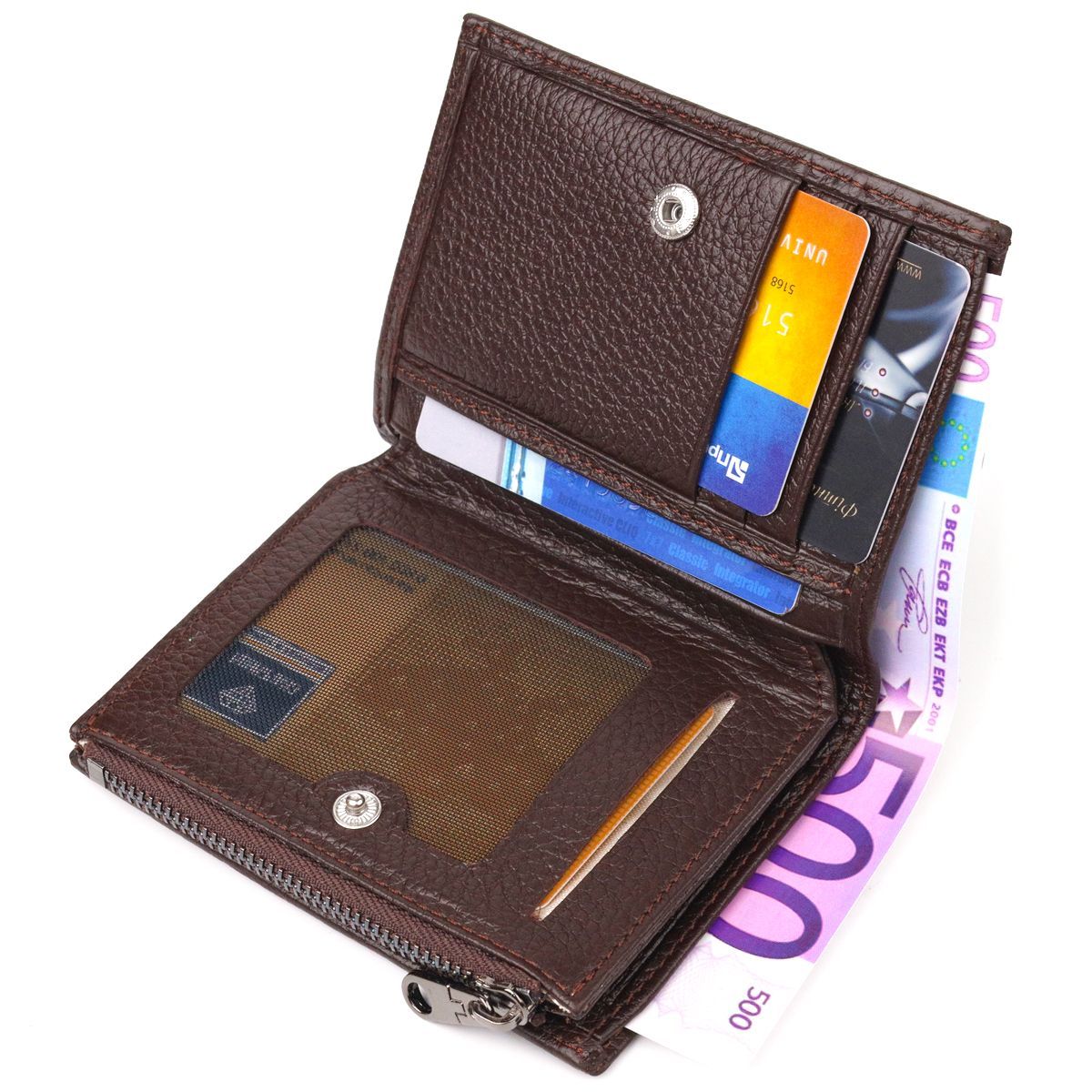 Небольшой мужской кошелек компактного размера из натуральной кожи. Аксессуар имеет отделение для купюр, монетницу, закрывающуюся на молнию, два скрытых кармана и десять ячеек для карточек, один под сеточкой. Закрывается аксессуар в два добавления на кнопку. Качественный кожаный аксессуар всегда считался показателем вкуса и изобилия, именно такие изделия представлены в нашем магазине, у нас каждый найдет что-нибудь для себя.
