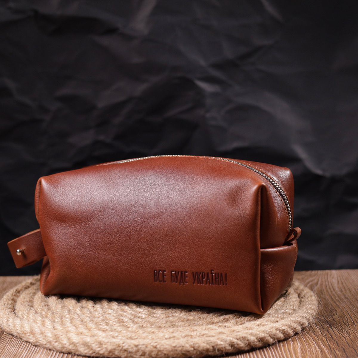 Вместительная мужская косметичка, большого размера, из гладкой натуральной кожи с патриотическим тиснением "Все будет Украина". Аксессуар на все случаи жизни, его можно использовать дома для хранения личных вещей, для поездок, спорта и прочего. Выполнен аксессуар из износостойкой натуральной кожи высокого качества. Цвет изделия – черный, глянцевая фактура гладкая. Упакованный несесер в фирменную сумку-чехол.