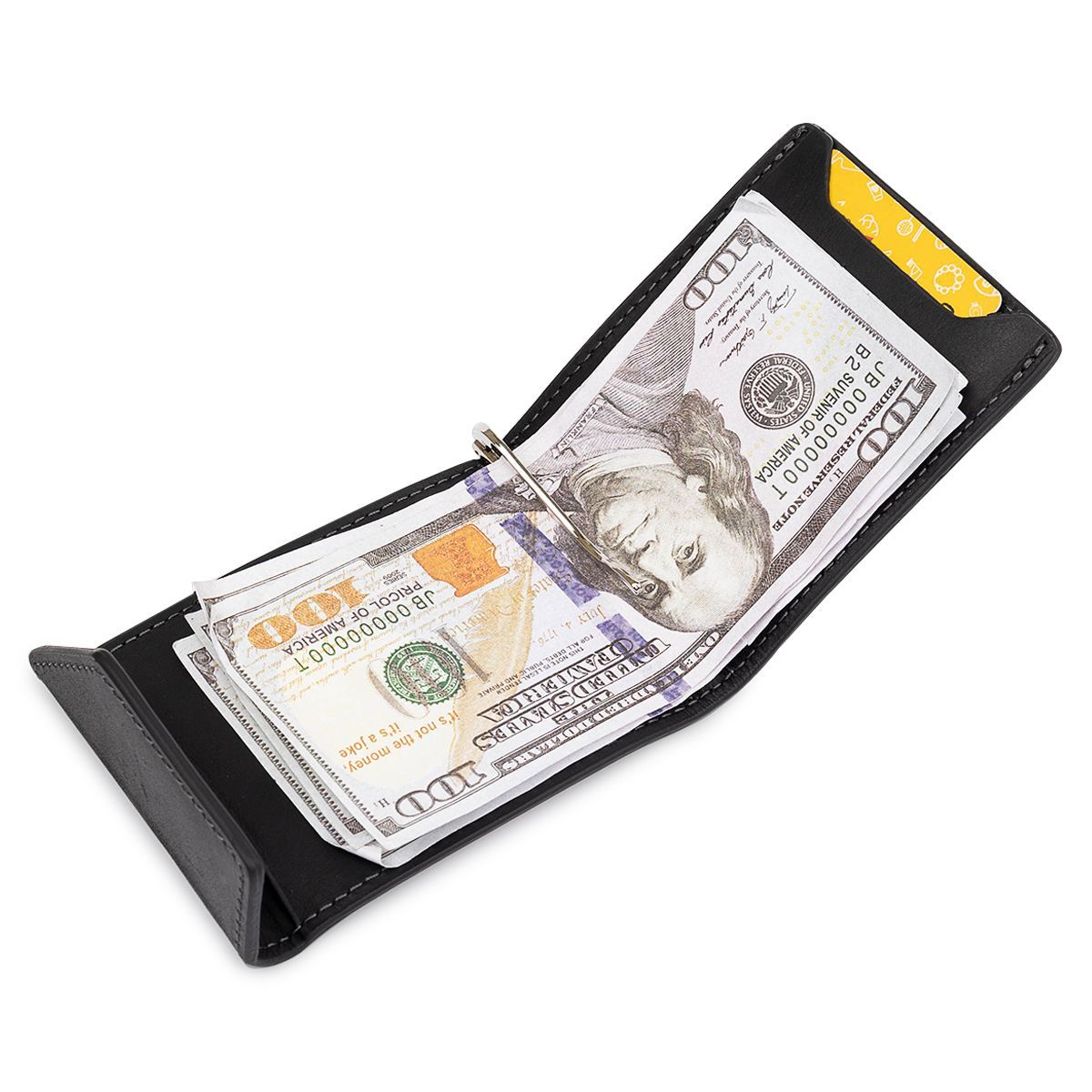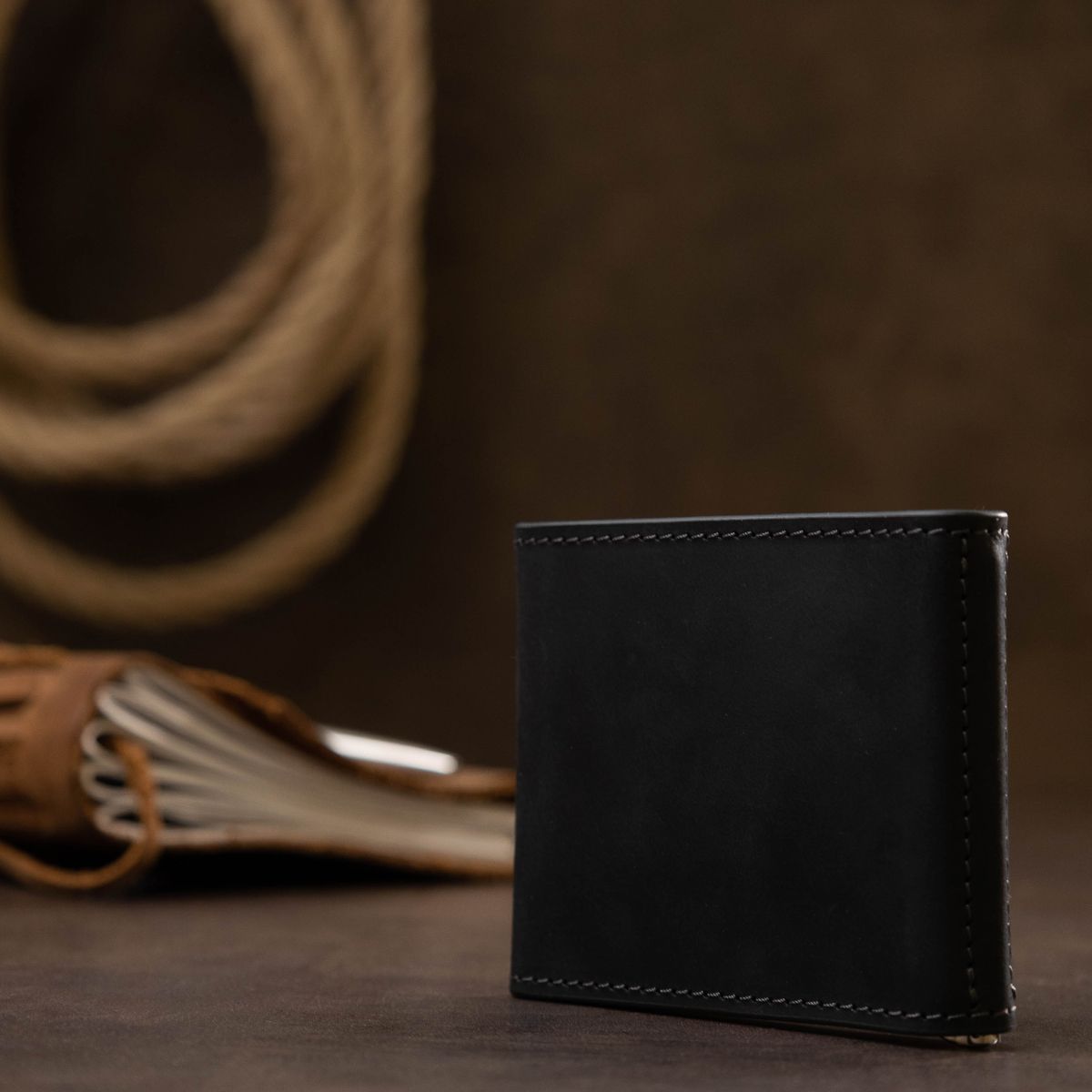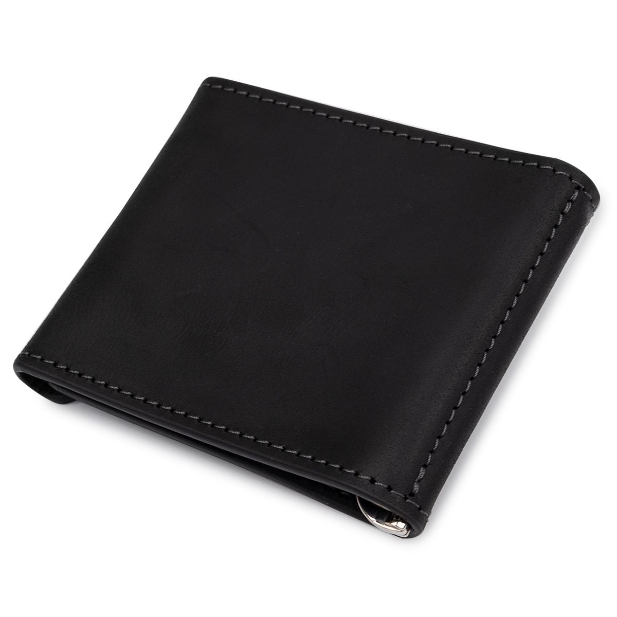 Компактный мужской зажим для денег для тех, кто не любит большие громоздкие кошельки. Имеет красивую матовую фактуру и черный универсальный цвет. Внутри кроме металлического зажима присутствуют два вместительных кармана для карточек. Выполнены изделия из натуральной высококлассной кожи.