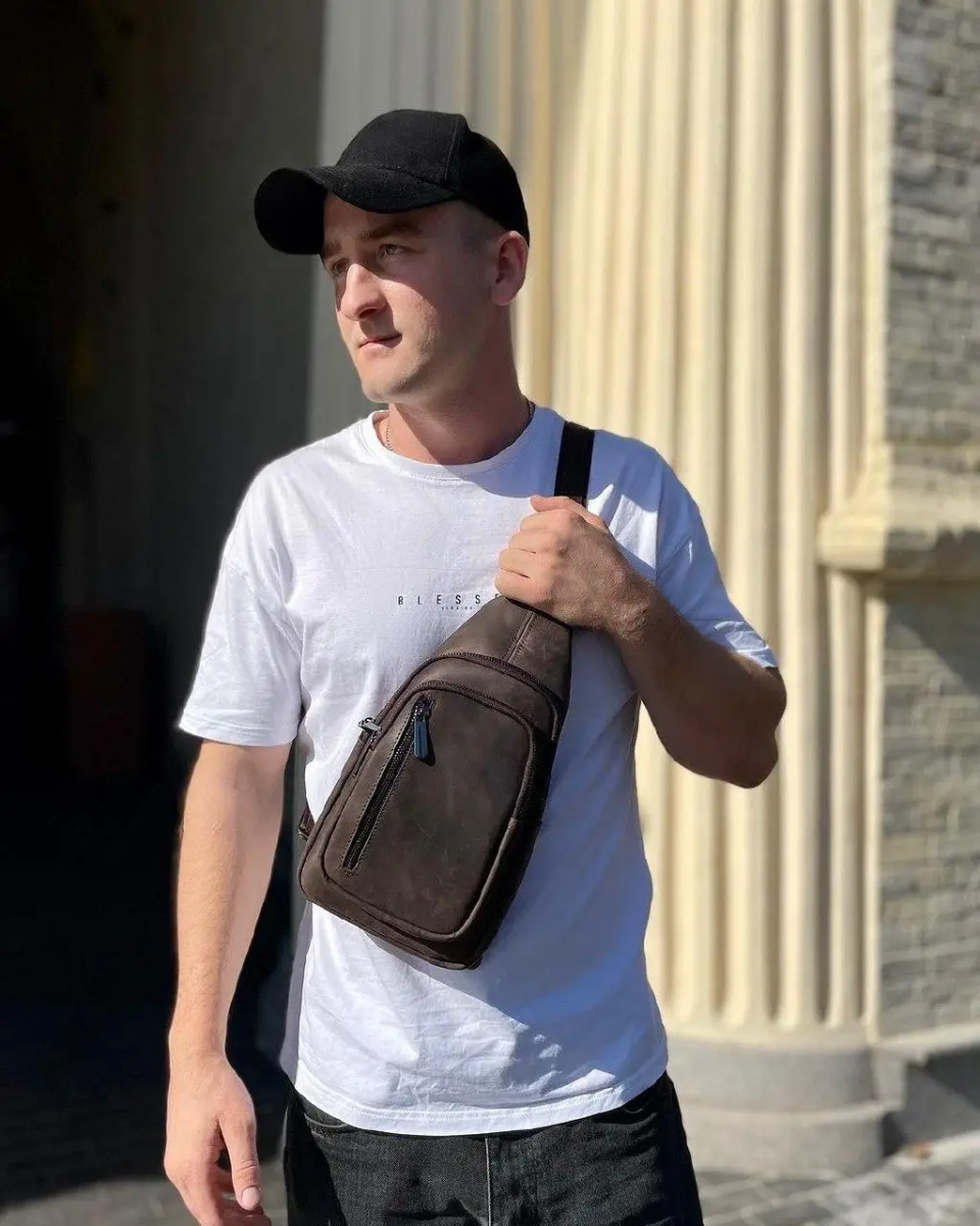 Месенджер на одну шлейку через плече із натуральної шкіри. Матова шкіра коричневого кольору, надійна срібляста фурнітура, зручні шкіряні пуллери та оптимальний розмір роблять цю модель дуже зручною у використанні. Шлейка виконана із щільного текстилю та перестібається на ліву чи праву сторону за допомогою карабіна. Слінг має одне головне відділення, у якому є маленькі кишені для дрібниць. Також з лицьового боку є додаткова кишеня на блискавці, а також маленька кишеня вертикального типу. З тильного боку є кишеня закритого типу.