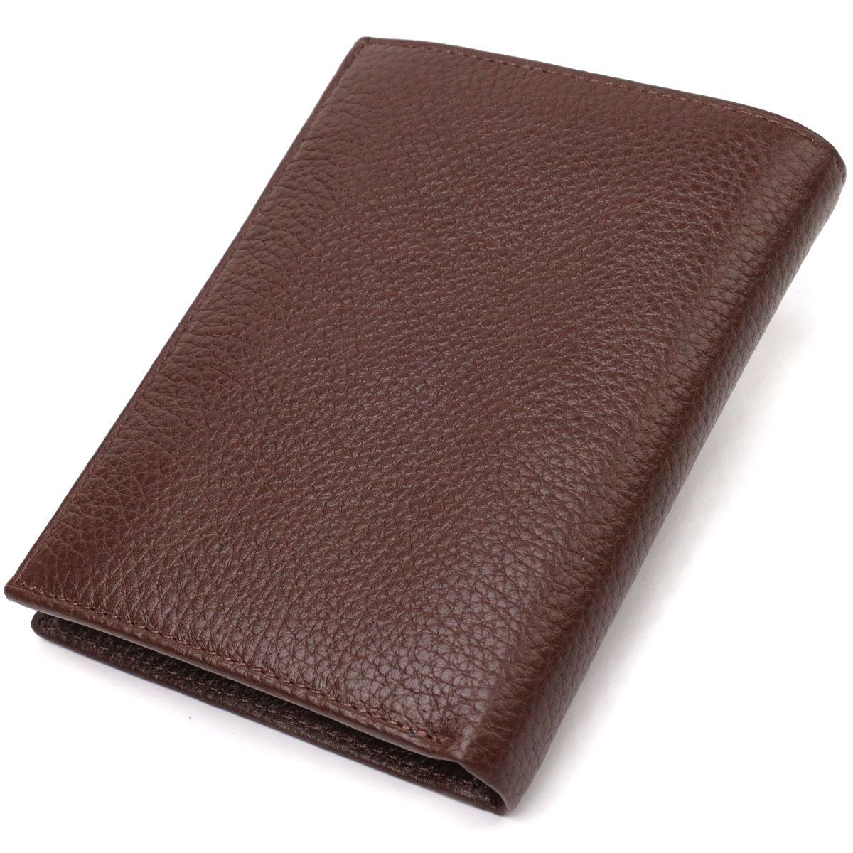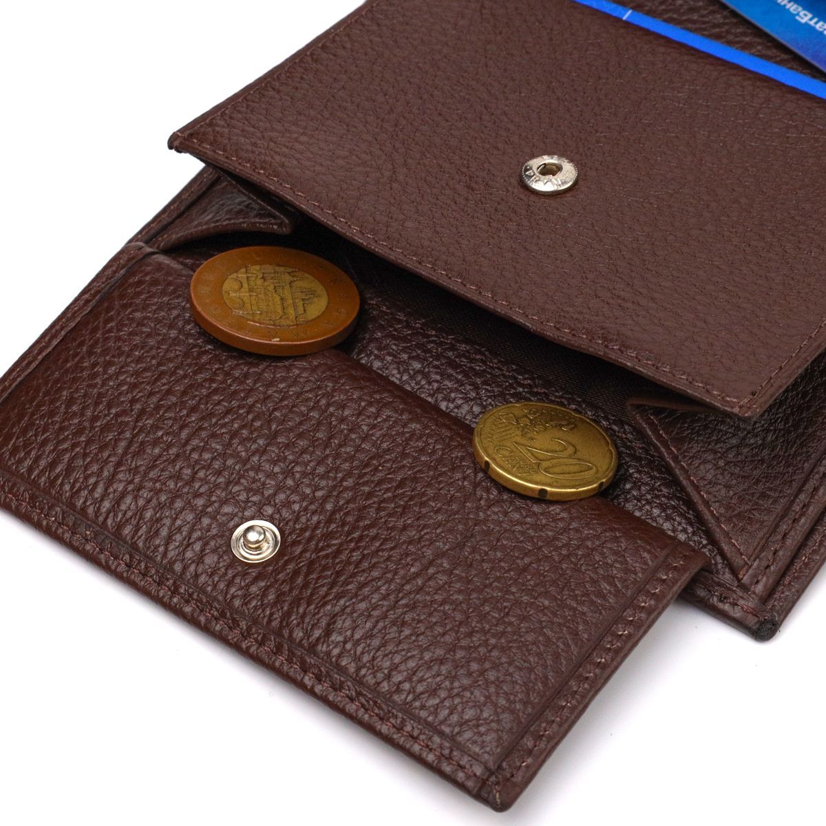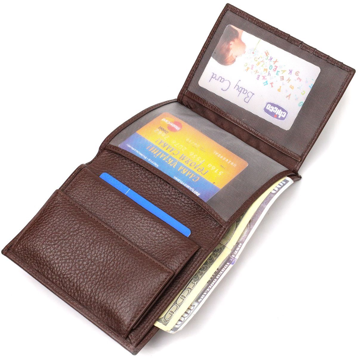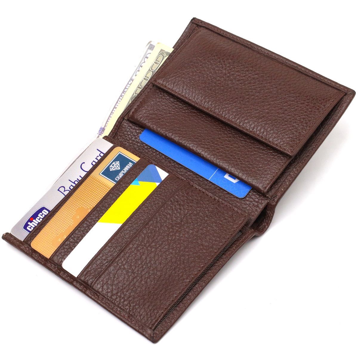 Стильный и красивый мужской кошелек в коричневом цвете из натуральной кожи. Аксессуар имеет одно основное отделение с перегородкой, в которое помещаются купюры всех номиналов, шесть карманов для карточек, два кармана под сеточкой для документов, монетницу и один близлежащий карман. Закрывается аксессуар пополам без застежки. Упакованный бумажник картонную коробку. Кожаный кошелек является отличным подарком для родных и близких людей.