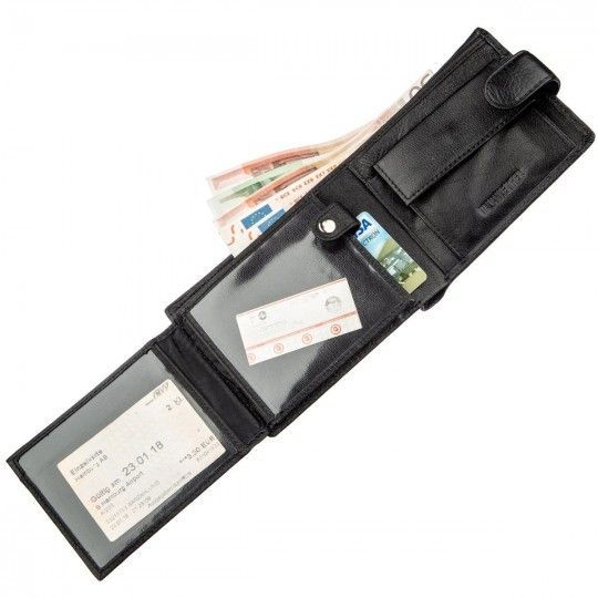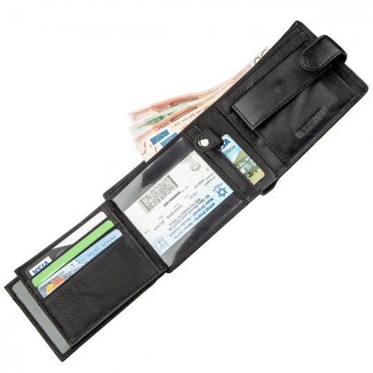 Универсальный кошелек для мужчин из натуральной кожи на кнопке. Выполнен в черном аристократическом цвете, что очень удобно и удобно. В кошельке есть достаточное количество отделений и карманов для разных ценностей, в том числе монетница на кнопке. Размеры изделия позволяют носить его как в кармане, так и в сумке или борсетке. Кошелек имеет деловой и сдержанный дизайн и подойдет для мужчин разного социального статуса. Этот аксессуар станет отличным приобретением для Вас лично или отличным презентом для любимого человека. Упаковка бумажника представлена в виде картонной коробки с фирменным логотипом белого цвета.