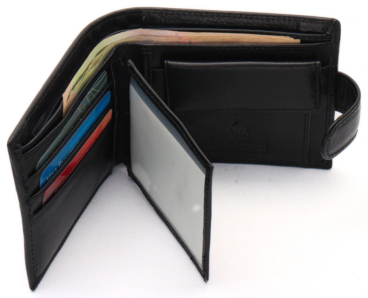 Чоловіче портмоне у класичному стилі підійде діловим людям. Модель оснащена двома прозорими віконцями для документів. Виріб фіксується кнопкою на хлястику, тому його зручно відкривати та швидко показувати перепустку або посвідчення. Для грошей відведено 3 великі відділення та вмістовна монетниця на кнопці. Три секції під картки розташовані у зручному місці та завжди під рукою. Дві прилеглі кишені допоможуть сховати гроші у надійному місці.