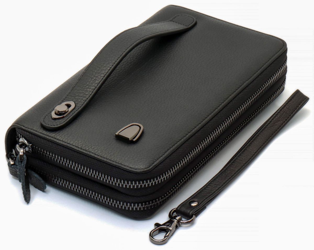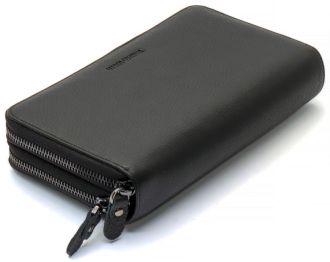 Чоловічий гаманець з натуральної шкіри підійде тим, хто цінує і стиль, і практичність. Модель має два окремі відділення на блискавці. Як в одному, так і в другому зручно тримати банкноти, а також розподіляти їх за номіналом. Додаткові суми (або чеки) можна відкладати у прилеглих кишенях. Для монет підходять кишені на блискавці, що служать перегородками. Кредитні картки в цьому шкіряному гаманці зберігаються в окремому блоці, що складається з 18 секцій. До того ж там є фіксатор для ручки. Завдяки двом ременям (на долоню та зап'ястя) аксесуар перетворюється або в портмоне, або в клатч.