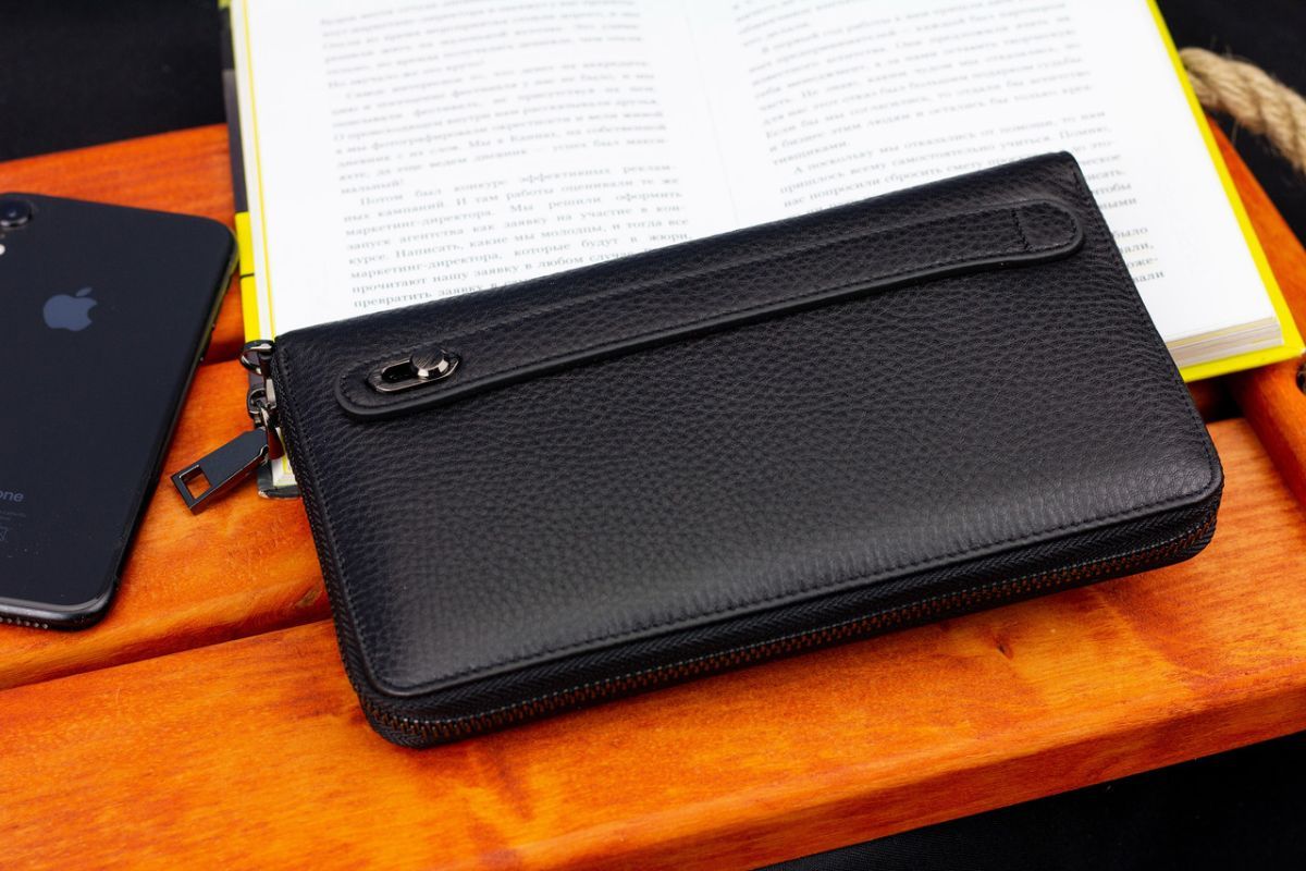 Шкіряний чоловічий гаманець оснащений двома ремінцями: на долоню та зап'ястя (знімний). Тому аксесуар можна носити у різний спосіб. Три відділення під купюри з розширювачами дуже вмістовні. Внутрішня перегородка на блискавці виконує роль кишеньки для монет. 2 прилеглі кишені вдало підходять для зберігання суми, яку потрібно відкласти. У цьому гаманці передбачено 12 секцій під банківські картки, які зручно виймати та засовувати назад.