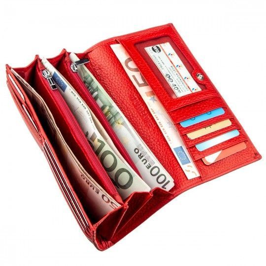Прекрасный женский кошелек яркого красного цвета для стильных и уверенных в себе дам. Выполнена из высококачественной натуральной кожи, имеет матовый оттенок и зернистую фактуру. Наполненный кошелек функциональными и практичными отделениями и карманами для карт и визиток. Для удобства отделение для монет и другой мелочи расположено на тыльной стороне кошелька. Эта отличная обновка станет для Вас настоящей находкой на долгое время. Также этот кошелек несомненно станет идеальным подарком для близкого человека на какой-нибудь праздник. Запакованный аксессуар в белую фирменную коробку из плотного картона.