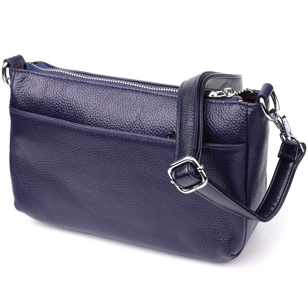 Сумка виконана з якісної, м'якої та приємної на дотик натуральної шкіри насиченого синього кольору, яка надає виробу елегантності та довговічності. З боків розташовані дві прилеглі кишені, що також закриваються на блискавці, що додає функціональності та допомагає краще організувати простір.